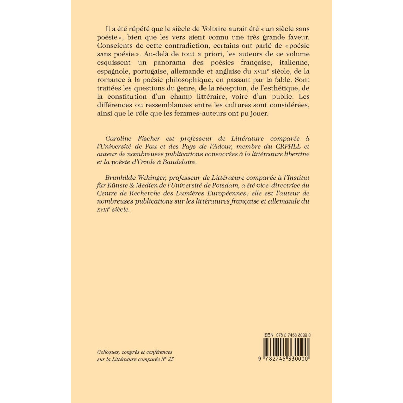 Il a été répété que le siècle de Voltaire aurait été « un siècle sans poésie », bien que les vers aient connu une très grande faveur. Conscients de cette contradiction, certains ont parlé de « poésie sans poésie ». Au-delà de tout a priori, les auteurs de ce volume esquissent un panorama des poésies française, italienne, espagnole, portugaise, allemande et anglaise du XVIIIe siècle, de la romance à la poésie philosophique, en passant par la fable. Sont traitées les questions du genre, de la réception, de l’esthétique, de la constitution d’un champ littéraire, voire d’un public. Les différences ou ressemblances entre les cultures sont considérées, ainsi que le rôle que les femmes-auteurs ont pu jouer.