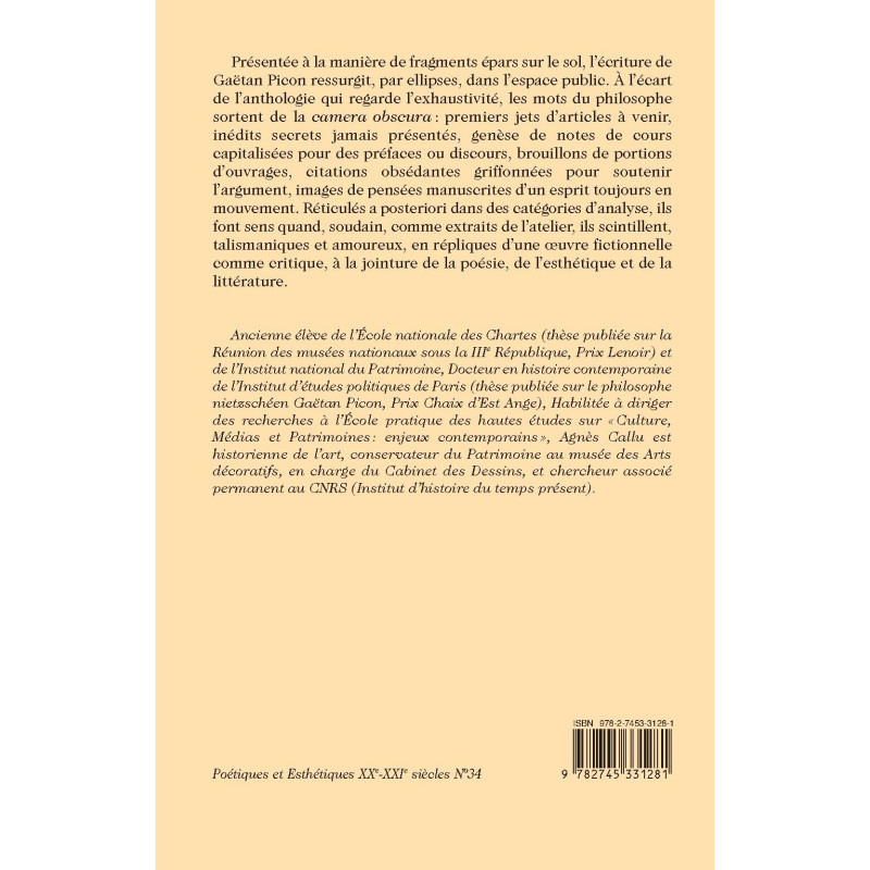 Présentée à la manière de fragments épars sur le sol, l’écriture de Gaëtan Picon ressurgit, par ellipses, dans l’espace public. À l’écart de l’anthologie qui regarde l’exhaustivité, les mots du philosophe sortent de la camera obscura : premiers jets d’articles à venir, inédits secrets jamais présentés, genèse de notes de cours capitalisées pour des préfaces ou discours, brouillons de portions d’ouvrages, citations obsédantes griffonnées pour soutenir l’argument, images de pensées manuscrites d’un esprit toujours en mouvement. Réticulés a posteriori dans des catégories d’analyse, ils font sens quand, soudain, comme extraits de l’atelier, ils scintillent, talismaniques et amoureux, en répliques d’une œuvre fictionnelle comme critique, à la jointure de la poésie, de l’esthétique et de la littérature.