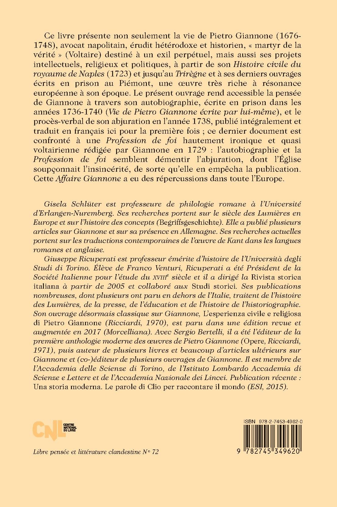 Ce livre présente non seulement la vie de Pietro Giannone (1676- 1748), avocat napolitain, érudit hétérodoxe et historien, « martyr de la vérité » (Voltaire) destiné à un exil perpétuel, mais aussi ses projets intellectuels, religieux et politiques, à partir de son Histoire civile du royaume de Naples (1723) et jusqu’au Trirègne et à ses derniers ouvrages écrits en prison au Piémont, une oeuvre très riche à résonance européenne à son époque. Le présent ouvrage rend accessible la pensée de Giannone à travers son autobiographie, écrite en prison dans les années 1736-1740 (Vie de Pietro Giannone écrite par lui-même), et le procès-verbal de son abjuration en l’année 1738, publié intégralement et traduit en français ici pour la première fois ; ce dernier document est confronté à une Profession de foi hautement ironique et quasi voltairienne rédigée par Giannone en 1729 : l’autobiographie et la Profession de foi semblent démentir l’abjuration, dont l’Église soupçonnait l’insincérité, de sorte qu’elle en empêcha la publication. Cette Affaire Giannone a eu des répercussions dans toute l’Europe.