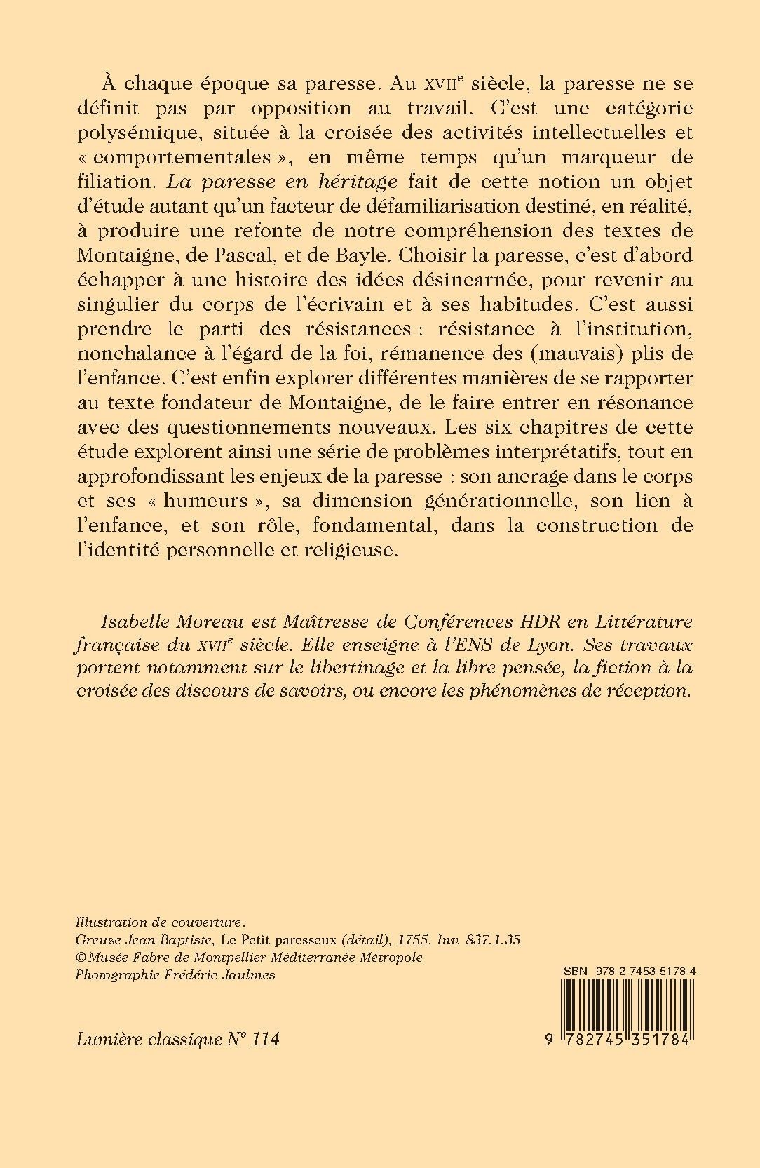 À chaque époque sa paresse. Au XVIIe siècle, la paresse ne se définit pas par opposition au travail. C’est une catégorie polysémique, située à la croisée des activités intellectuelles et « comportementales », en même temps qu’un marqueur de filiation. La paresse en héritage fait de cette notion un objet d’étude autant qu’un facteur de défamiliarisation destiné, en réalité, à produire une refonte de notre compréhension des textes de Montaigne, de Pascal, et de Bayle. Choisir la paresse, c’est d’abord échapper à une histoire des idées désincarnée, pour revenir au singulier du corps de l’écrivain et à ses habitudes. C’est aussi prendre le parti des résistances : résistance à l’institution, nonchalance à l’égard de la foi, rémanence des (mauvais) plis de l’enfance. C’est enfin explorer différentes manières de se rapporter au texte fondateur de Montaigne, de le faire entrer en résonance avec des questionnements nouveaux. Les six chapitres de cette étude explorent ainsi une série de problèmes interprétatifs, tout en approfondissant les enjeux de la paresse : son ancrage dans le corps et ses « humeurs », sa dimension générationnelle, son lien à l’enfance, et son rôle, fondamental, dans la construction de l’identité personnelle et religieuse.