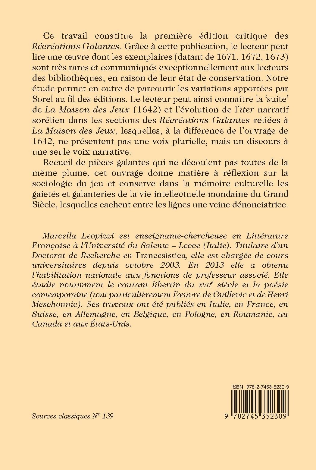 Ce travail constitue la première édition critique des Récréations Galantes. Grâce à cette publication, le lecteur peut lire une oeuvre dont les exemplaires (datant de 1671, 1672, 1673) sont très rares et communiqués exceptionnellement aux lecteurs des bibliothèques, en raison de leur état de conservation. Notre étude permet en outre de parcourir les variations apportées par Sorel au fil des éditions. Le lecteur peut ainsi connaître la ‘suite’ de La Maison des Jeux (1642) et l’évolution de l’iter narratif sorélien dans les sections des Récréations Galantes reliées à La Maison des Jeux, lesquelles, à la différence de l’ouvrage de 1642, ne présentent pas une voix plurielle, mais un discours à une seule voix narrative.