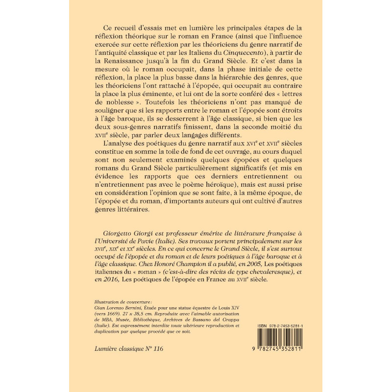 L’analyse des poétiques du genre narratif aux XVIe et XVIIe siècles constitue en somme la toile de fond de cet ouvrage, au cours duquel sont non seulement examinés quelques épopées et quelques romans du Grand Siècle particulièrement significatifs (et mis en évidence les rapports que ces derniers entretiennent ou n’entretiennent pas avec le poème héroïque), mais est aussi prise en considération l’opinion que se sont faite, à la même époque, de l’épopée et du roman, d’importants auteurs qui ont cultivé d’autres genres littéraires.