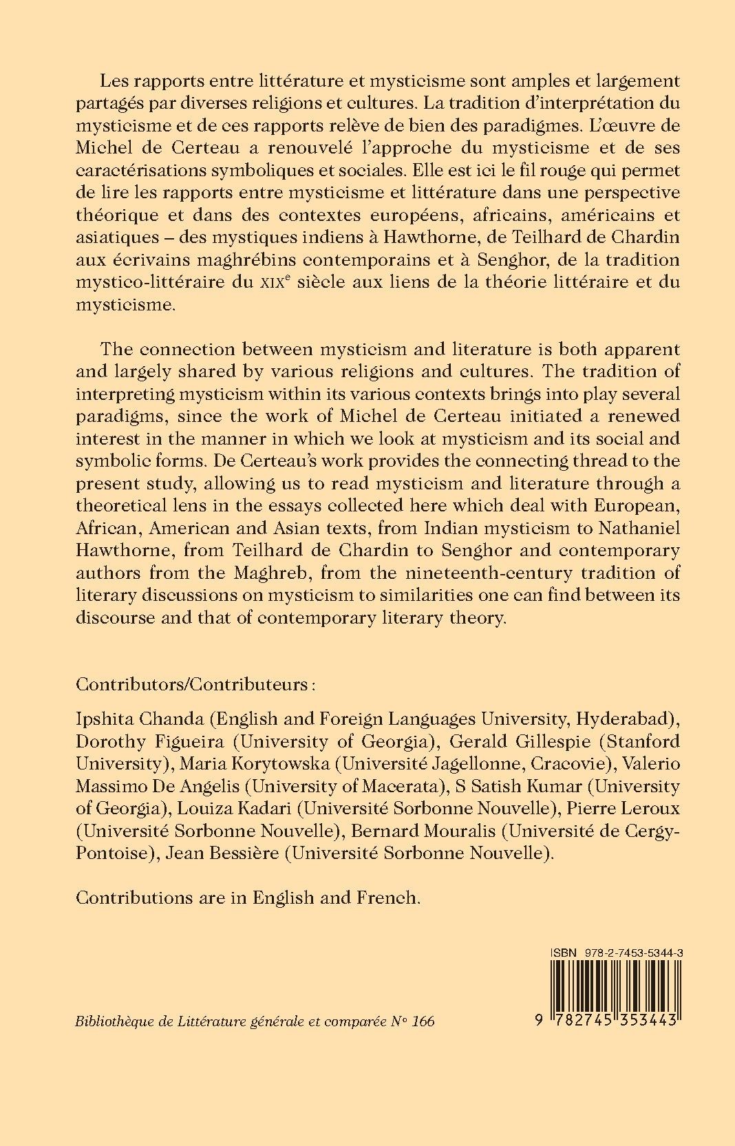 The connection between mysticism and literature is both apparent and largely shared by various religions and cultures. The tradition of interpreting mysticism within its various contexts brings into play several paradigms, since the work of Michel de Certeau initiated a renewed interest in the manner in which we look at mysticism and its social and symbolic forms. De Certeau’s work provides the connecting thread to the present study, allowing us to read mysticism and literature through a theoretical lens in the essays collected here which deal with European, African, American and Asian texts, from Indian mysticism to Nathaniel Hawthorne, from Teilhard de Chardin to Senghor and contemporary authors from the Maghreb, from the nineteenth-century tradition of literary discussions on mysticism to similarities one can find between its discourse and that of contemporary literary theory.