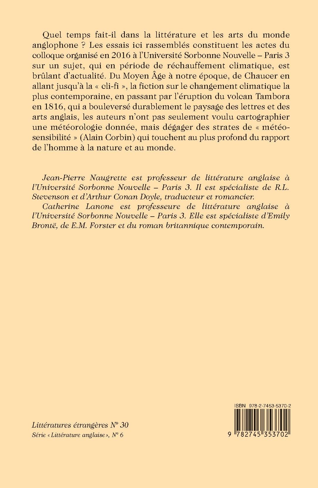 Quel temps fait-il dans la littérature et les arts du monde anglophone ? Les essais ici rassemblés constituent les actes du colloque organisé en 2016 à l’Université Sorbonne Nouvelle – Paris 3 sur un sujet, qui en période de réchauffement climatique, est brûlant d’actualité. Du Moyen Âge à notre époque, de Chaucer en allant jusqu’à la « cli-fi », la fiction sur le changement climatique la plus contemporaine, en passant par l’éruption du volcan Tambora en 1816, qui a bouleversé durablement le paysage des lettres et des arts anglais, les auteurs n’ont pas seulement voulu cartographier une météorologie donnée, mais dégager des strates de « météosensibilité » (Alain Corbin) qui touchent au plus profond du rapport de l’homme à la nature et au monde.