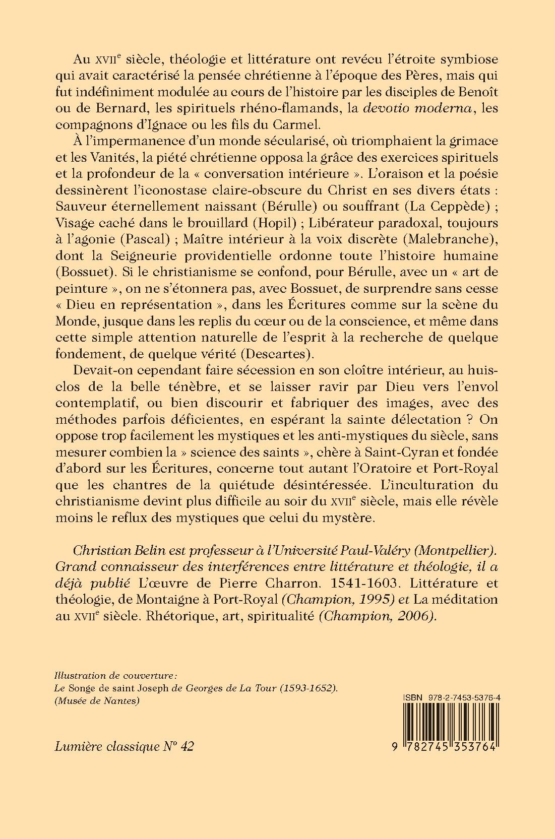 Christian Belin est professeur à l’Université Paul-Valéry (Montpellier). Grand connaisseur des interférences entre littérature et théologie, il a déjà publié L’œuvre de Pierre Charron. 1541-1603. Littérature et théologie, de Montaigne à Port-Royal (Champion, 1995) et La méditation au XVIIe siècle. Rhétorique, art, spiritualité (Champion, 2006).