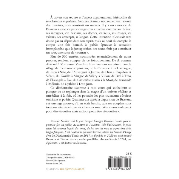 Ce dictionnaire s’adresse à tous ceux qui souhaitent se plonger ou se replonger dans la magie d’un univers réaliste et surréaliste à la fois, où les portraits les plus truculents côtoient onirisme et poésie. Quarante ans après la disparition de Brassens, cet ouvrage prouve, s’il en était besoin, que ses couplets sont toujours vivants et que ses chansons sont faites « non seulement pour être écoutées mais surtout pour être réécoutées ».