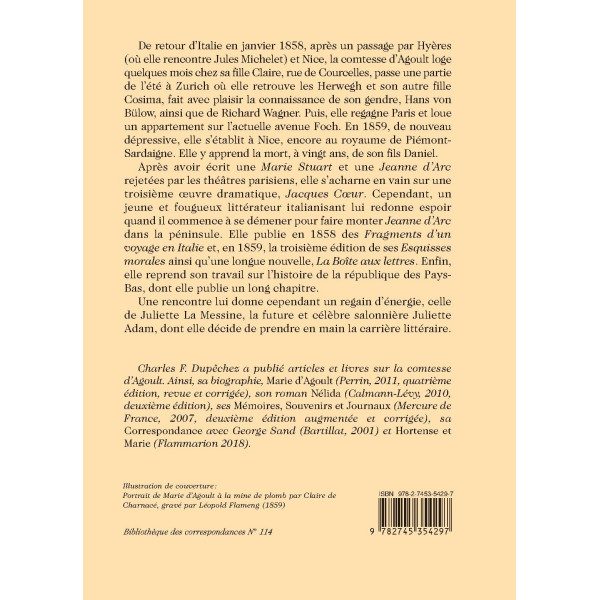 Charles F. Dupêchez a publié articles et livres sur la comtesse d’Agoult. Ainsi, sa biographie, Marie d’Agoult (Perrin, 2011, quatrième édition, revue et corrigée), son roman Nélida (Calmann-Lévy, 2010, deuxième édition), ses Mémoires, Souvenirs et Journaux (Mercure de France, 2007, deuxième édition augmentée et corrigée), sa Correspondance avec George Sand (Bartillat, 2001) et Hortense et Marie (Flammarion 2018).