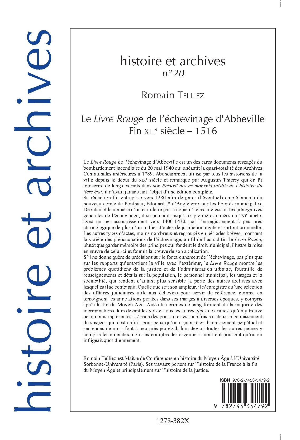 Le Livre Rouge de l’échevinage d’Abbeville est un des rares documents rescapés du bombardement incendiaire du 20 mai 1940 qui anéantit la quasi-totalité des Archives Communales antérieures à 1789. Abondamment utilisé par tous les historiens de la ville depuis le début du XIXe siècle et remarqué par Augustin Thierry qui en fit transcrire de longs extraits dans son Recueil des monuments inédits de l’histoire du tiers état, il n’avait jamais fait l’objet d’une édition complète.