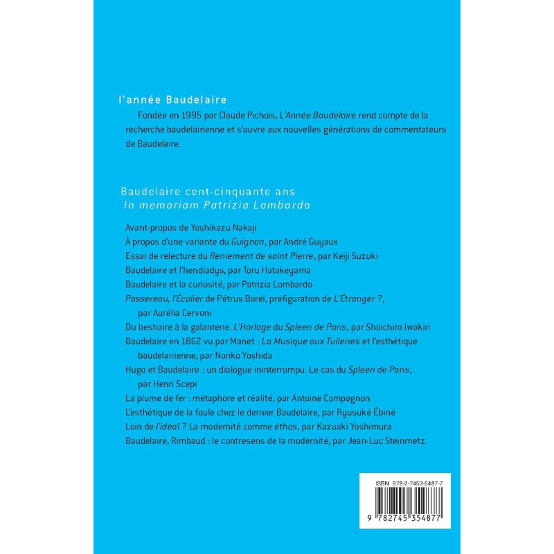 Fondée en 1995 par Claude Pichois, L’Année Baudelaire rend compte de la recherche baudelairienne et s’ouvre aux nouvelles générations de commentateurs de Baudelaire.