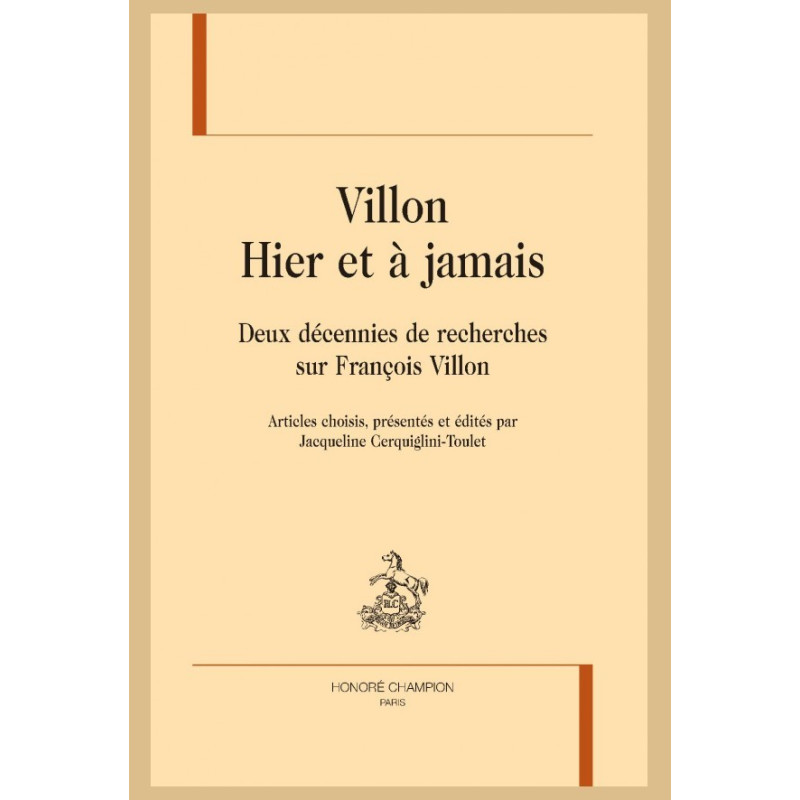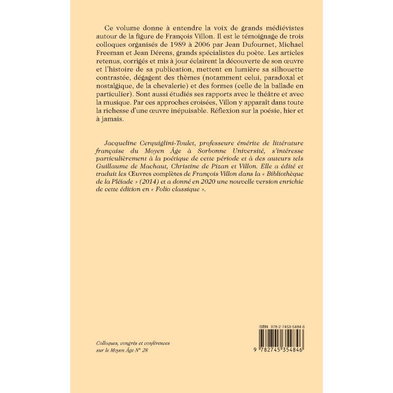 Ce volume donne à entendre la voix de grands médiévistes autour de la figure de François Villon. Il est le témoignage de trois colloques organisés de 1989 à 2006 par Jean Dufournet, Michael Freeman et Jean Dérens, grands spécialistes du poète. Les articles retenus, corrigés et mis à jour éclairent la découverte de son oeuvre et l’histoire de sa publication, mettent en lumière sa silhouette contrastée, dégagent des thèmes (notamment celui, paradoxal et nostalgique, de la chevalerie) et des formes (celle de la ballade en particulier). Sont aussi étudiés ses rapports avec le théâtre et avec la musique. Par ces approches croisées, Villon y apparaît dans toute la richesse d’une œuvre inépuisable. Réflexion sur la poésie, hier et à jamais.