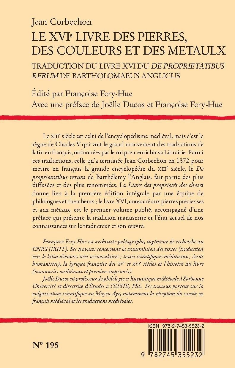 Le XIIIe siècle est celui de l’encyclopédisme médiéval, mais c’est le règne de Charles V qui voit le grand mouvement des traductions de latin en français, ordonnées par le roi pour enrichir sa Librairie. Parmi ces traductions, celle qu’a terminée Jean Corbechon en 1372 pour mettre en français la grande encyclopédie du XIIIe siècle, le De proprietatibus rerum de Barthélemy l’Anglais, fait partie des plus diffusées et des plus renommées. Le Livre des proprietés des choses donne lieu à la première édition intégrale par une équipe de philologues et chercheurs ; le livre XVI, consacré aux pierres précieuses et aux métaux, est le premier volume publié, accompagné d’une préface qui présente la tradition manuscrite et l’état actuel de nos connaissances sur le traducteur et son œuvre.