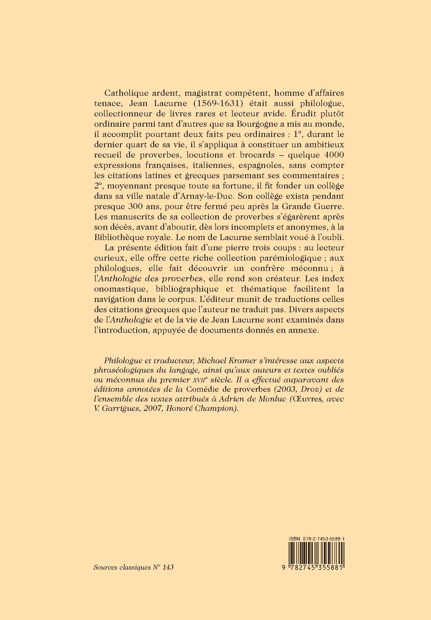 La présente édition fait d’une pierre trois coups : au lecteur curieux, elle offre cette riche collection parémiologique ; aux philologues, elle fait découvrir un confrère méconnu ; à l’Anthologie des proverbes, elle rend son créateur. Les index onomastique, bibliographique et thématique facilitent la navigation dans le corpus. L’éditeur munit de traductions celles des citations grecques que l’auteur ne traduit pas. Divers aspects de l’Anthologie et de la vie de Jean Lacurne sont examinés dans l’introduction, appuyée de documents donnés en annexe.