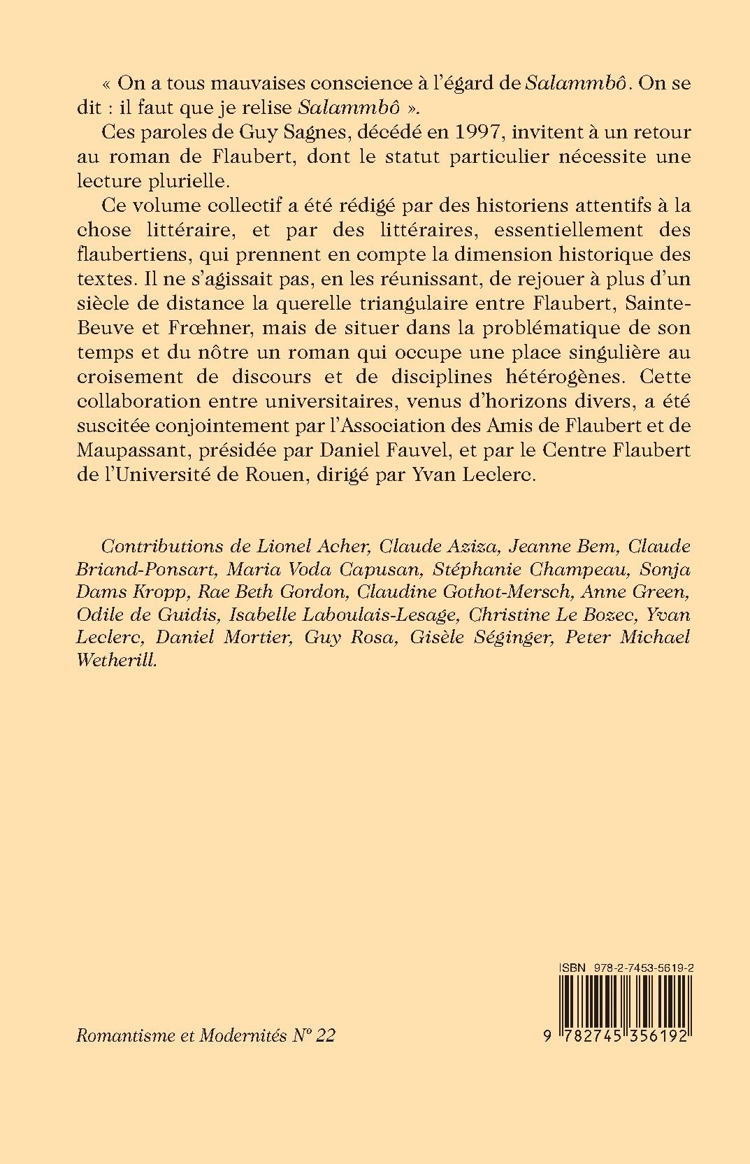 Ce volume collectif a été rédigé par des historiens attentifs à la chose littéraire, et par des littéraires, essentiellement des flaubertiens, qui prennent en compte la dimension historique des textes. Il ne s’agissait pas, en les réunissant, de rejouer à plus d’un siècle de distance la querelle triangulaire entre Flaubert, Sainte- Beuve et Froehner, mais de situer dans la problématique de son temps et du nôtre un roman qui occupe une place singulière au croisement de discours et de disciplines hétérogènes. Cette collaboration entre universitaires, venus d’horizons divers, a été suscitée conjointement par l’Association des Amis de Flaubert et de Maupassant, présidée par Daniel Fauvel, et par le Centre Flaubert de l’Université de Rouen, dirigé par Yvan Leclerc.