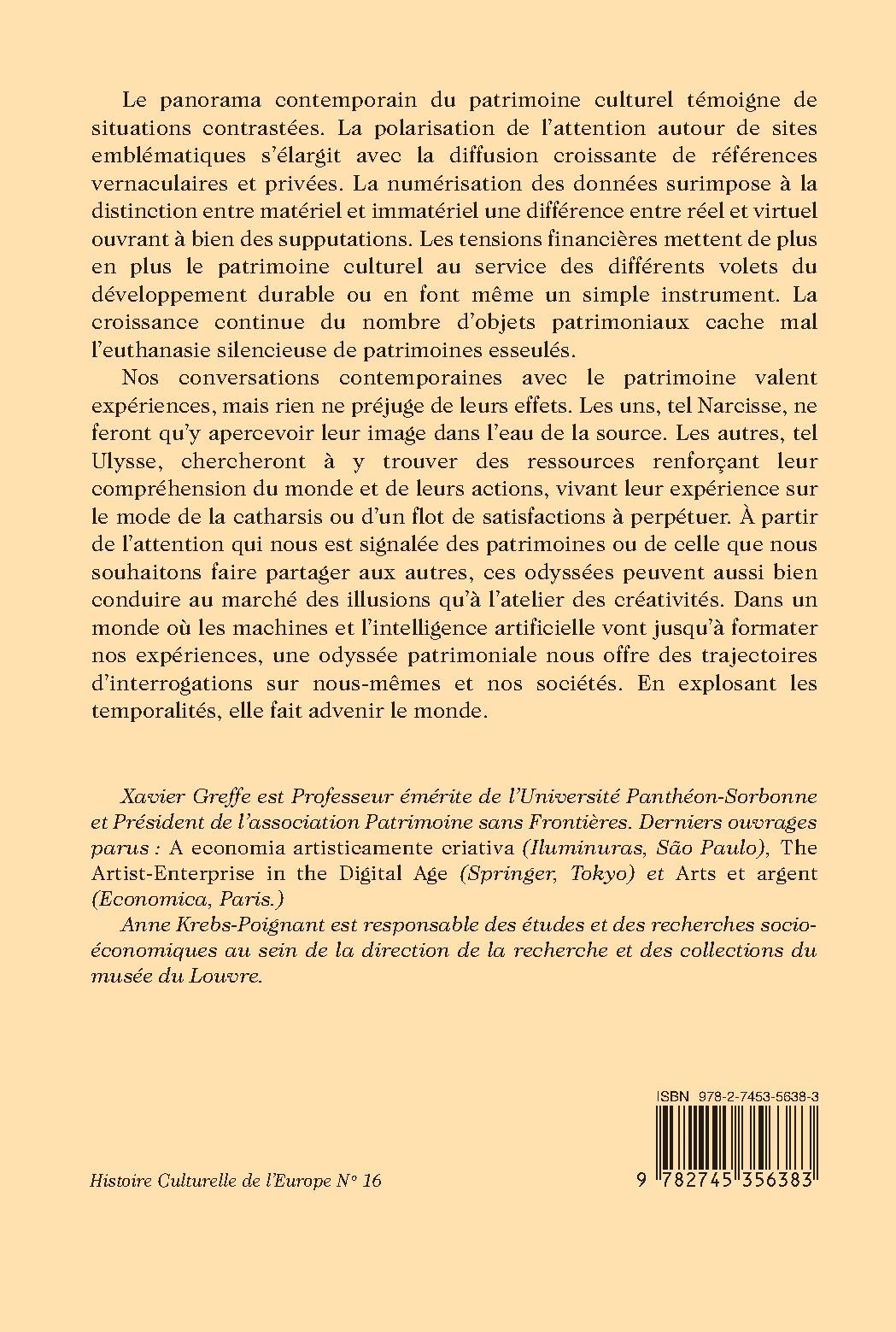 Nos conversations contemporaines avec le patrimoine valent expériences, mais rien ne préjuge de leurs effets. Les uns, tel Narcisse, ne feront qu’y apercevoir leur image dans l’eau de la source. Les autres, tel Ulysse, chercheront à y trouver des ressources renforçant leur compréhension du monde et de leurs actions, vivant leur expérience sur le mode de la catharsis ou d’un flot de satisfactions à perpétuer. À partir de l’attention qui nous est signalée des patrimoines ou de celle que nous souhaitons faire partager aux autres, ces odyssées peuvent aussi bien conduire au marché des illusions qu’à l’atelier des créativités. Dans un monde où les machines et l’intelligence artificielle vont jusqu’à formater nos expériences, une odyssée patrimoniale nous offre des trajectoires d’interrogations sur nous-mêmes et nos sociétés. En explosant les temporalités, elle fait advenir le monde.