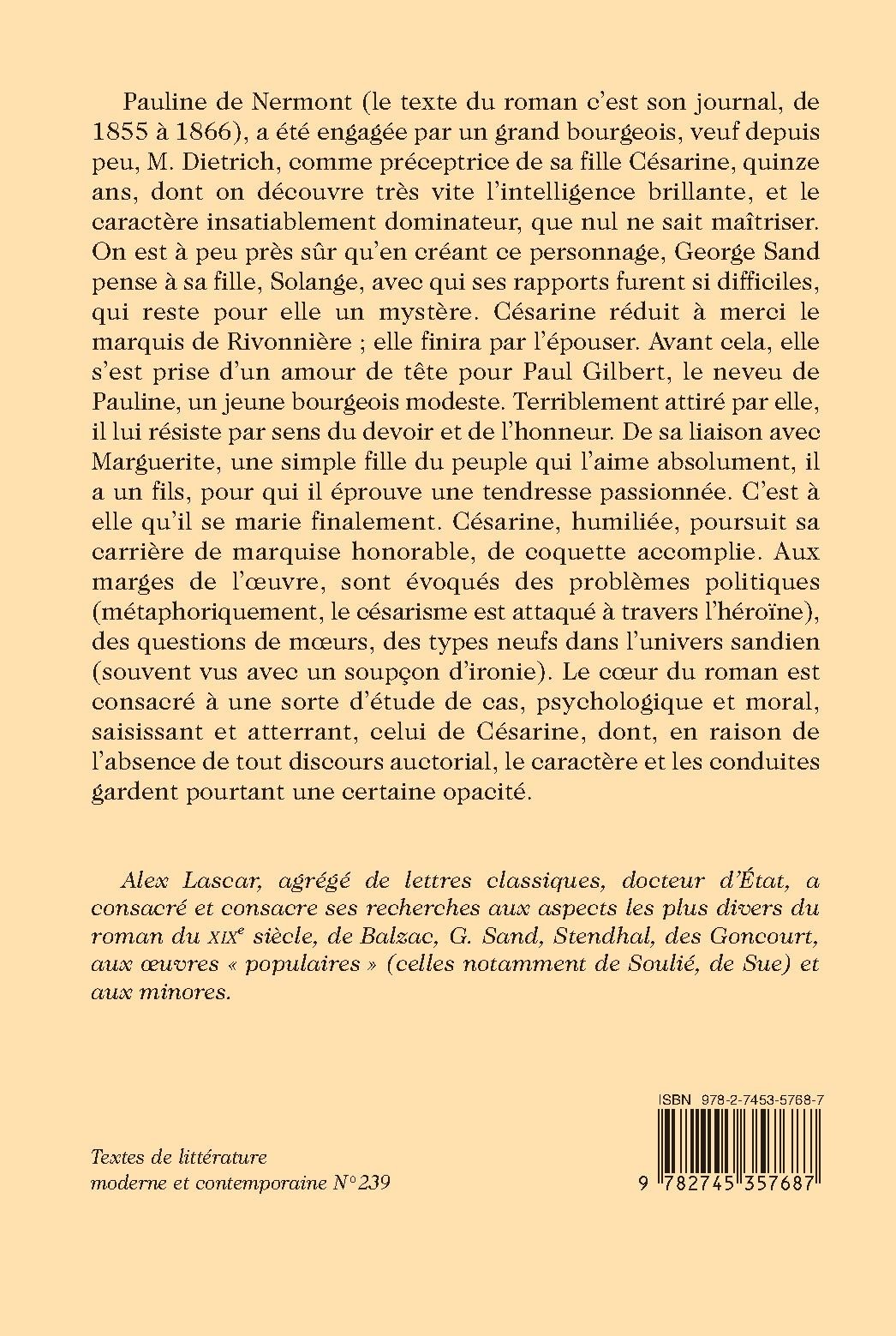 Pauline de Nermont (le texte du roman c’est son journal, de 1855 à 1866), a été engagée par un grand bourgeois, veuf depuis peu, M. Dietrich, comme préceptrice de sa fille Césarine, quinze ans, dont on découvre très vite l’intelligence brillante, et le caractère insatiablement dominateur, que nul ne sait maîtriser. On est à peu près sûr qu’en créant ce personnage, George Sand pense à sa fille, Solange, avec qui ses rapports furent si difficiles, qui reste pour elle un mystère. Césarine réduit à merci le marquis de Rivonnière ; elle finira par l’épouser. Avant cela, elle s’est prise d’un amour de tête pour Paul Gilbert, le neveu de Pauline, un jeune bourgeois modeste. Terriblement attiré par elle, il lui résiste par sens du devoir et de l’honneur. De sa liaison avec Marguerite, une simple fille du peuple qui l’aime absolument, il a un fils, pour qui il éprouve une tendresse passionnée. C’est à elle qu’il se marie finalement. Césarine, humiliée, poursuit sa carrière de marquise honorable, de coquette accomplie. Aux marges de l’œuvre, sont évoqués des problèmes politiques (métaphoriquement, le césarisme est attaqué à travers l’héroïne), des questions de mœurs, des types neufs dans l’univers sandien (souvent vus avec un soupçon d’ironie). Le cœur du roman est consacré à une sorte d’étude de cas, psychologique et moral, saisissant et atterrant, celui de Césarine, dont, en raison de l’absence de tout discours auctorial, le caractère et les conduites gardent pourtant une certaine opacité.