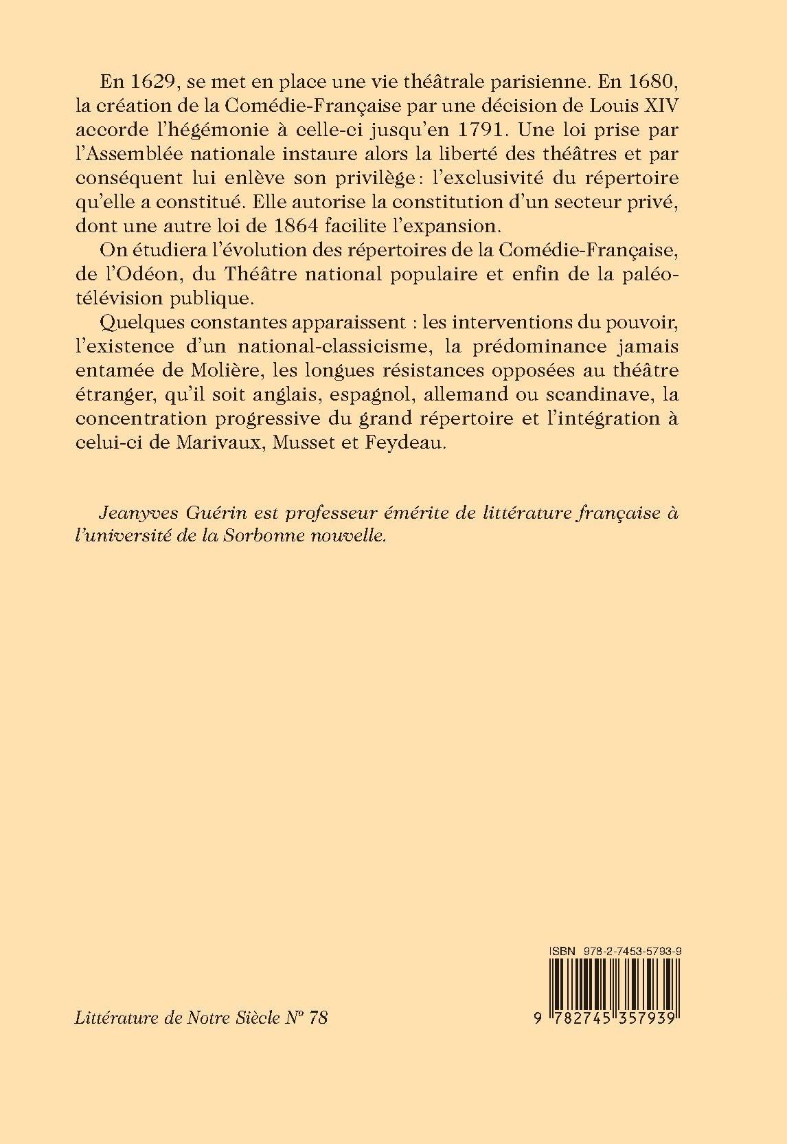 Quelques constantes apparaissent : les interventions du pouvoir, l’existence d’un national-classicisme, la prédominance jamais entamée de Molière, les longues résistances opposées au théâtre étranger, qu’il soit anglais, espagnol, allemand ou scandinave, la concentration progressive du grand répertoire et l’intégration à celui-ci de Marivaux, Musset et Feydeau.