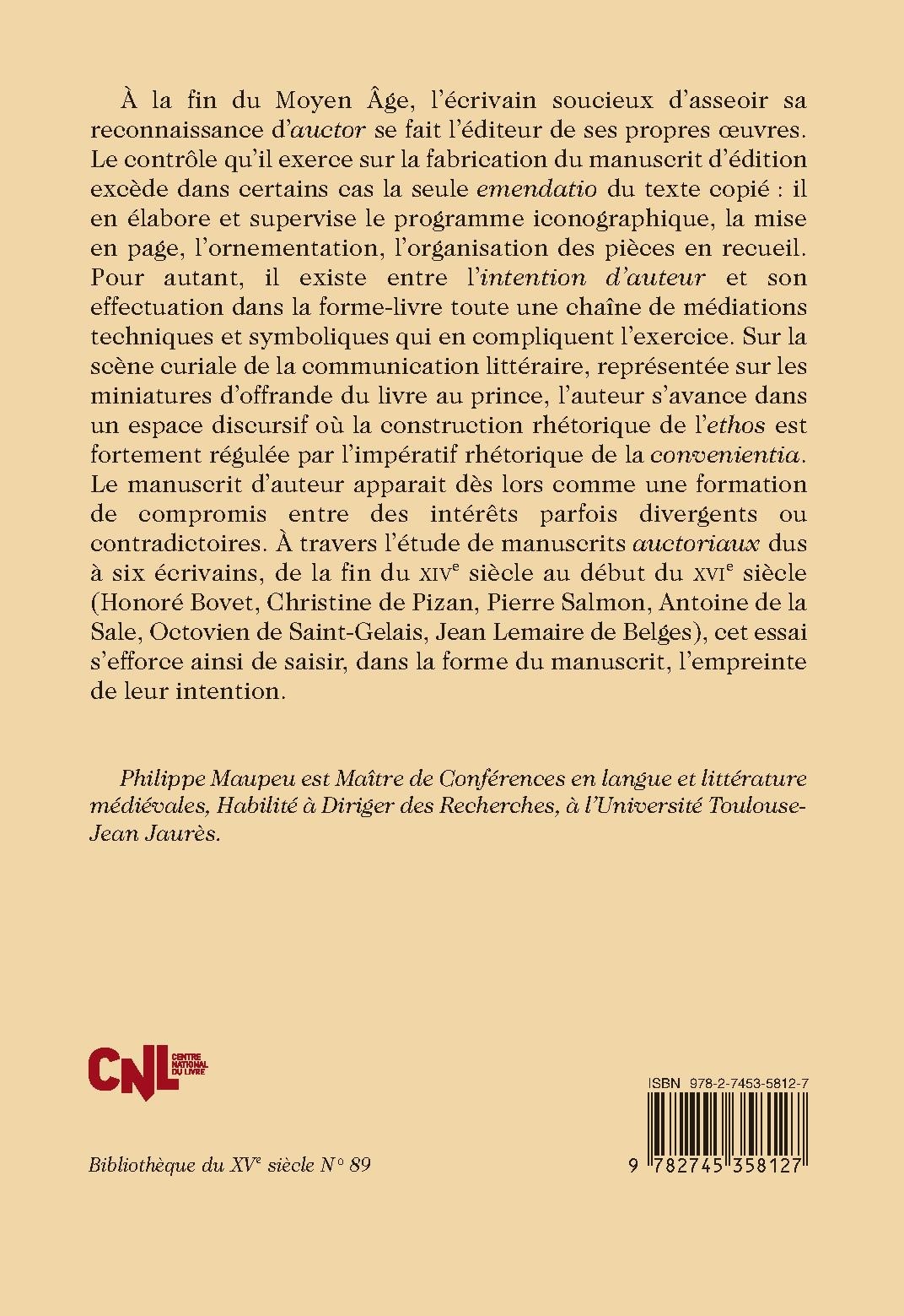À la fin du Moyen Âge, l’écrivain soucieux d’asseoir sa reconnaissance d’auctor se fait l’éditeur de ses propres œuvres. Le contrôle qu’il exerce sur la fabrication du manuscrit d’édition excède dans certains cas la seule emendatio du texte copié : il en élabore et supervise le programme iconographique, la mise en page, l’ornementation, l’organisation des pièces en recueil. Pour autant, il existe entre l’intention d’auteur et son effectuation dans la forme-livre toute une chaîne de médiations techniques et symboliques qui en compliquent l’exercice. Sur la scène curiale de la communication littéraire, représentée sur les miniatures d’offrande du livre au prince, l’auteur s’avance dans un espace discursif où la construction rhétorique de l’ethos est fortement régulée par l’impératif rhétorique de la convenientia. Le manuscrit d’auteur apparait dès lors comme une formation de compromis entre des intérêts parfois divergents ou contradictoires. À travers l’étude de manuscrits auctoriaux dus à six écrivains, de la fin du XIVe siècle au début du XVIe siècle (Honoré Bovet, Christine de Pizan, Pierre Salmon, Antoine de la Sale, Octovien de Saint-Gelais, Jean Lemaire de Belges), cet essai s’efforce ainsi de saisir, dans la forme du manuscrit, l’empreinte de leur intention.