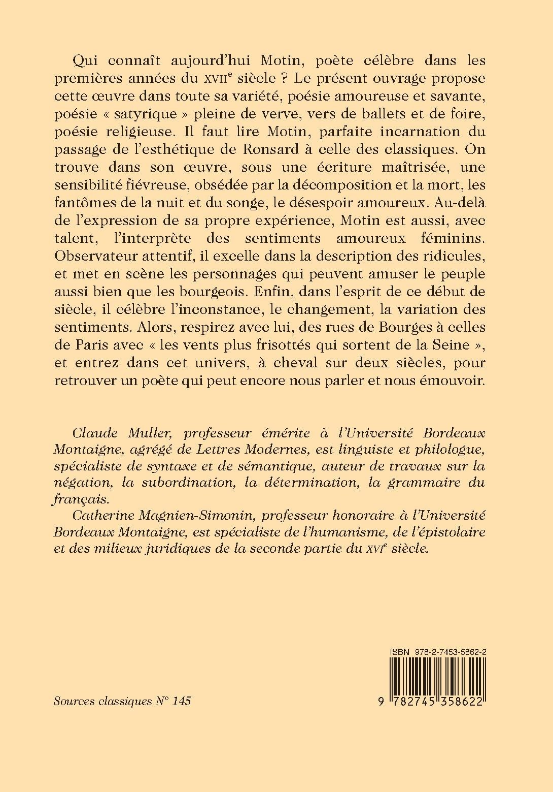 Qui connaît aujourd’hui Motin, poète célèbre dans les premières années du XVIIe siècle ? Le présent ouvrage propose cette œuvre dans toute sa variété, poésie amoureuse et savante, poésie « satyrique » pleine de verve, vers de ballets et de foire, poésie religieuse. Il faut lire Motin, parfaite incarnation du passage de l’esthétique de Ronsard à celle des classiques. On trouve dans son œuvre, sous une écriture maîtrisée, une sensibilité fiévreuse, obsédée par la décomposition et la mort, les fantômes de la nuit et du songe, le désespoir amoureux. Au-delà de l’expression de sa propre expérience, Motin est aussi, avec talent, l’interprète des sentiments amoureux féminins. Observateur attentif, il excelle dans la description des ridicules, et met en scène les personnages qui peuvent amuser le peuple aussi bien que les bourgeois. Enfin, dans l’esprit de ce début de siècle, il célèbre l’inconstance, le changement, la variation des sentiments. Alors, respirez avec lui, des rues de Bourges à celles de Paris avec « les vents plus frisottés qui sortent de la Seine », et entrez dans cet univers, à cheval sur deux siècles, pour retrouver un poète qui peut encore nous parler et nous émouvoir.