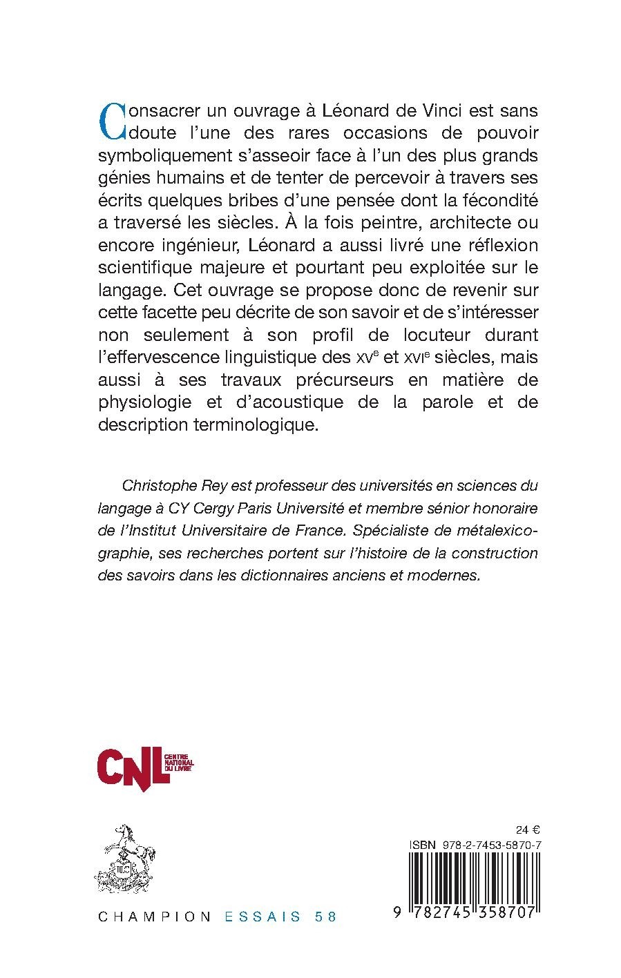 Consacrer un ouvrage à Léonard de Vinci est sans doute l’une des rares occasions de pouvoir symboliquement s’asseoir face à l’un des plus grands génies humains et de tenter de percevoir à travers ses écrits quelques bribes d’une pensée dont la fécondité a traversé les siècles. À la fois peintre, architecte ou encore ingénieur, Léonard a aussi livré une réflexion scientifique majeure et pourtant peu exploitée sur le langage. Cet ouvrage se propose donc de revenir sur cette facette peu décrite de son savoir et de s’intéresser non seulement à son profil de locuteur durant l’effervescence linguistique des XVe et XVIe siècles, mais aussi à ses travaux précurseurs en matière de physiologie et d’acoustique de la parole et de description terminologique.