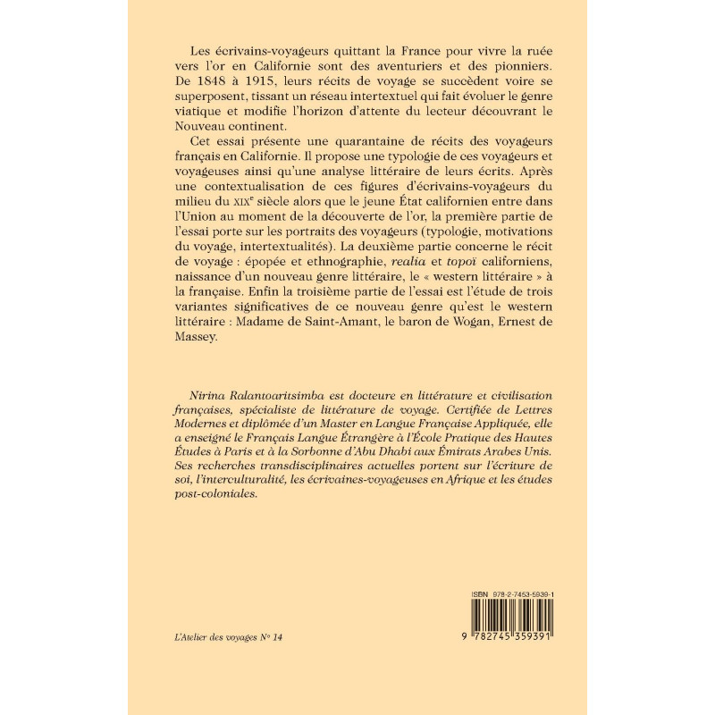 Cet essai présente une quarantaine de récits des voyageurs français en Californie. Il propose une typologie de ces voyageurs et voyageuses ainsi qu’une analyse littéraire de leurs écrits. Après une contextualisation de ces figures d’écrivains-voyageurs du milieu du XIXe siècle alors que le jeune État californien entre dans l’Union au moment de la découverte de l’or, la première partie de l’essai porte sur les portraits des voyageurs (typologie, motivations du voyage, intertextualités). La deuxième partie concerne le récit de voyage : épopée et ethnographie, realia et topoï californiens, naissance d’un nouveau genre littéraire, le « western littéraire » à la française. Enfin la troisième partie de l’essai est l’étude de trois variantes significatives de ce nouveau genre qu’est le western littéraire : Madame de Saint-Amant, le baron de Wogan, Ernest de Massey.