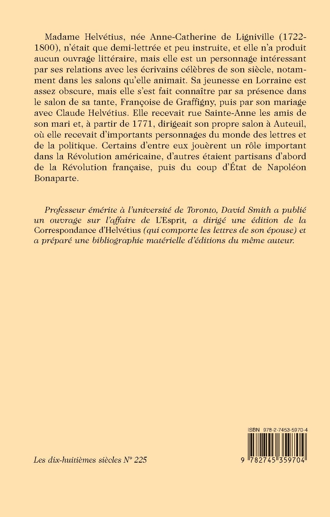Professeur émérite à l’université de Toronto, David Smith a publié un ouvrage sur l’affaire de L’Esprit, a dirigé une édition de la Correspondance d’Helvétius (qui comporte les lettres de son épouse) et a préparé une bibliographie matérielle d’éditions du même auteur.