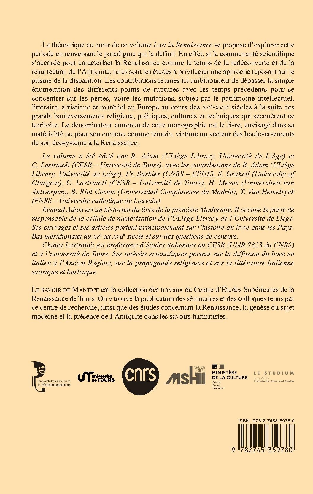La thématique au cœur de ce volume Lost in Renaissance se propose d’explorer cette période en renversant le paradigme qui la définit. En effet, si la communauté scientifique s’accorde pour caractériser la Renaissance comme le temps de la redécouverte et de la résurrection de l’Antiquité, rares sont les études à privilégier une approche reposant sur le prisme de la disparition. Les contributions réunies ici ambitionnent de dépasser la simple énumération des différents points de ruptures avec les temps précédents pour se concentrer sur les pertes, voire les mutations, subies par le patrimoine intellectuel, littéraire, artistique et matériel en Europe au cours des XVe-XVIIe siècles à la suite des grands bouleversements religieux, politiques, culturels et techniques qui secouèrent ce territoire. Le dénominateur commun de cette monographie est le livre, envisagé dans sa matérialité ou pour son contenu comme témoin, victime ou vecteur des bouleversements de son écosystème à la Renaissance.