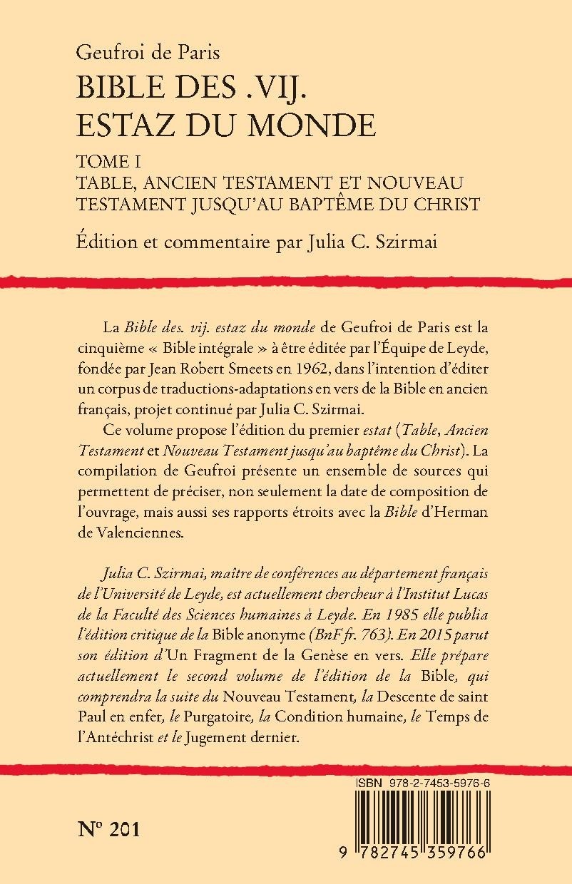 La Bible des. vij. estaz du monde de Geufroi de Paris est la cinquième « Bible intégrale » à être éditée par l’Équipe de Leyde, fondée par Jean Robert Smeets en 1962, dans l’intention d’éditer un corpus de traductions-adaptations en vers de la Bible en ancien français, projet continué par Julia C. Szirmai.