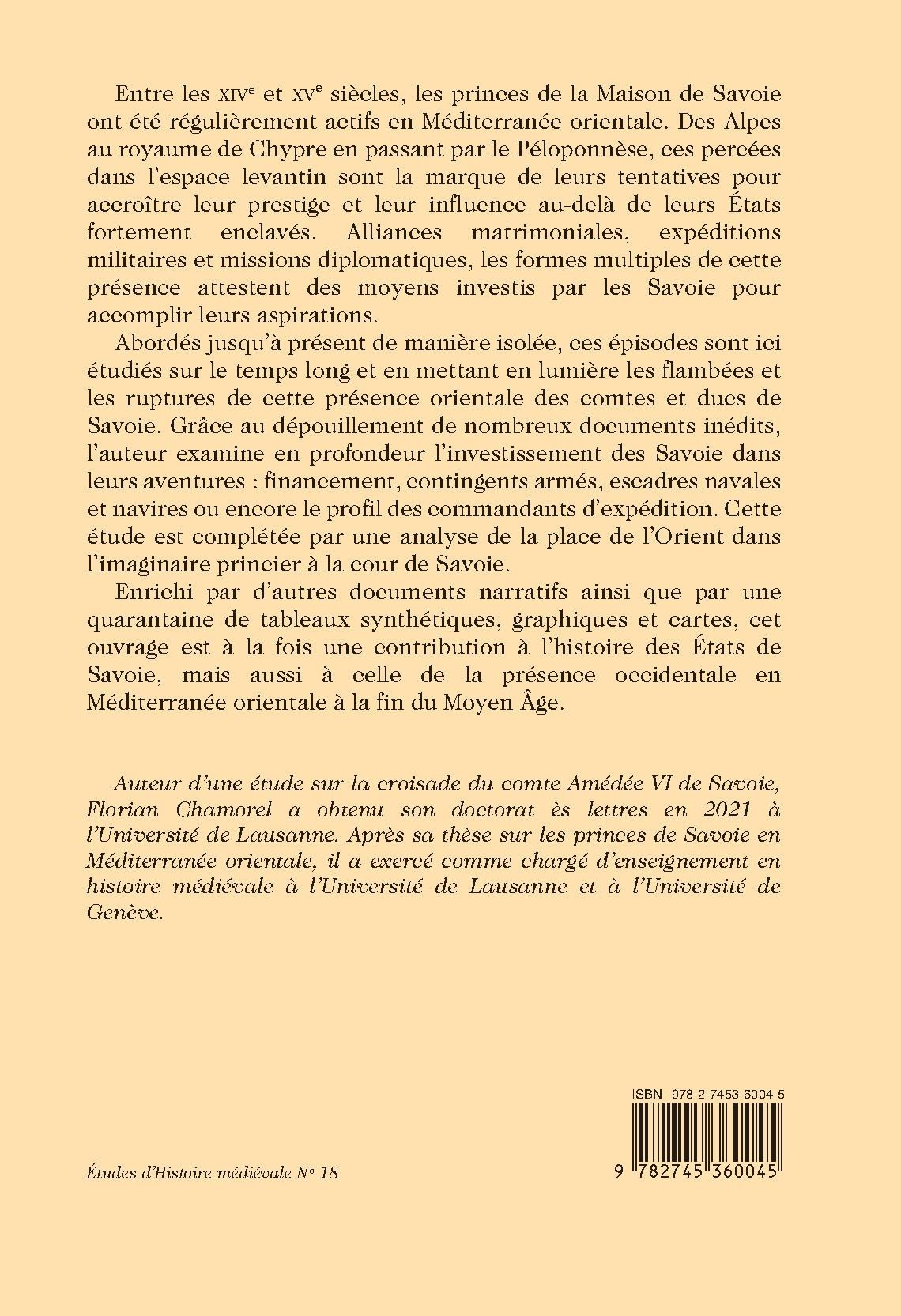Entre les XIVe et XVe siècles, les princes de la Maison de Savoie ont été régulièrement actifs en Méditerranée orientale. Des Alpes au royaume de Chypre en passant par le Péloponnèse, ces percées dans l’espace levantin sont la marque de leurs tentatives pour accroître leur prestige et leur influence au-delà de leurs États fortement enclavés. Alliances matrimoniales, expéditions militaires et missions diplomatiques, les formes multiples de cette présence attestent des moyens investis par les Savoie pour accomplir leurs aspirations.