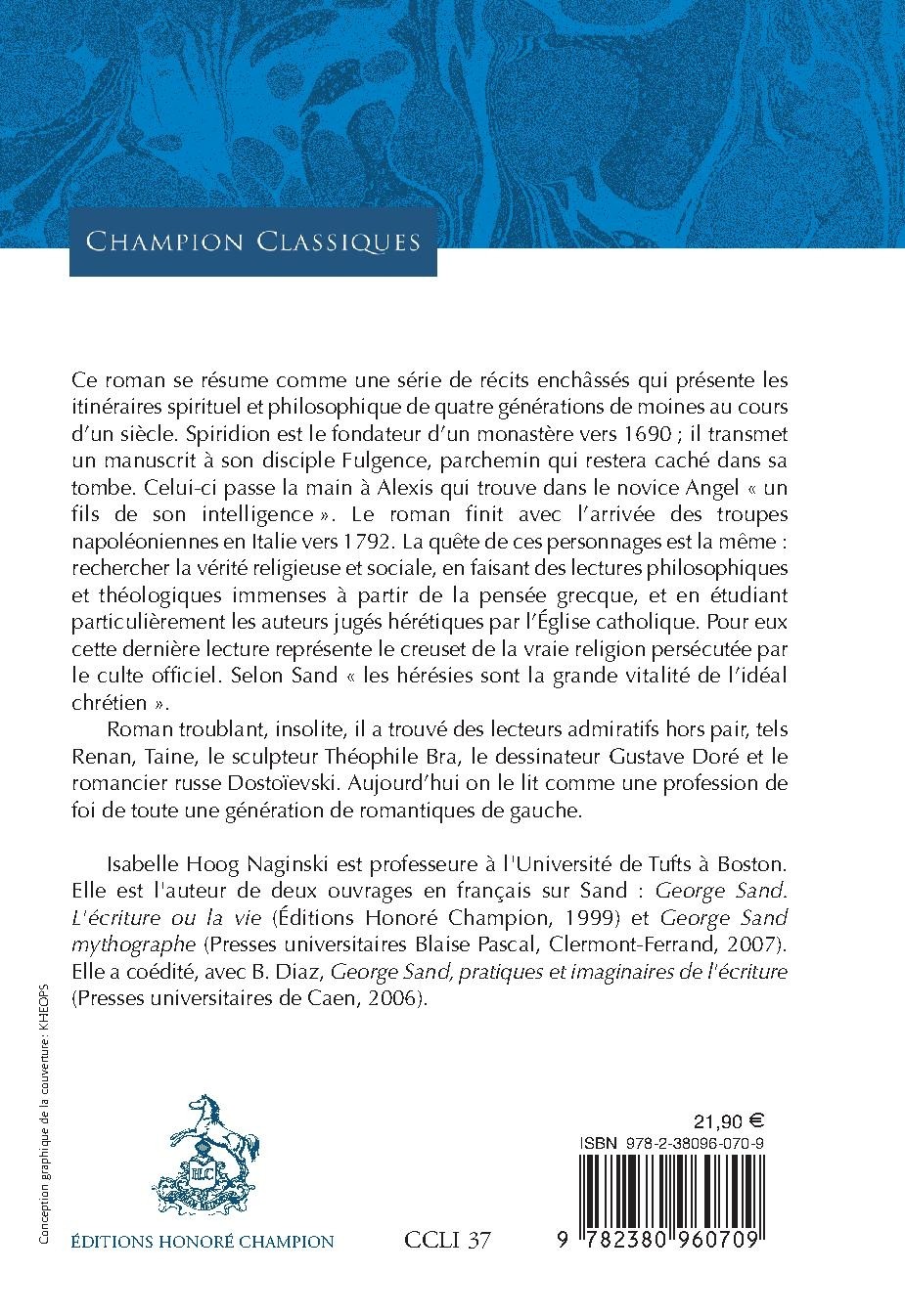 Ce roman se résume comme une série de récits enchâssés qui présente les itinéraires spirituel et philosophique de quatre générations de moines au cours d’un siècle. Spiridion est le fondateur d’un monastère vers 1690 ; il transmet un manuscrit à son disciple Fulgence, parchemin qui restera caché dans sa tombe. Celui-ci passe la main à Alexis qui trouve dans le novice Angel « un fils de son intelligence ». Le roman finit avec l’arrivée des troupes napoléoniennes en Italie vers 1792. La quête de ces personnages est la même : rechercher la vérité religieuse et sociale, en faisant des lectures philosophiques et théologiques immenses à partir de la pensée grecque, et en étudiant particulièrement les auteurs jugés hérétiques par l’Église catholique. Pour eux cette dernière lecture représente le creuset de la vraie religion persécutée par le culte officiel. Selon Sand « les hérésies sont la grande vitalité de l’idéal chrétien ».