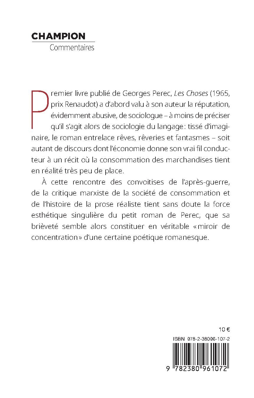 Premier livre publié de Georges Perec, Les Choses (1965, prix Renaudot) a d’abord valu à son auteur la réputation, évidemment abusive, de sociologue – à moins de préciser qu’il s’agit alors de sociologie du langage : tissé d’imaginaire, le roman entrelace rêves, rêveries et fantasmes – soit autant de discours dont l’économie donne son vrai fil conducteur à un récit où la consommation des marchandises tient en réalité très peu de place.