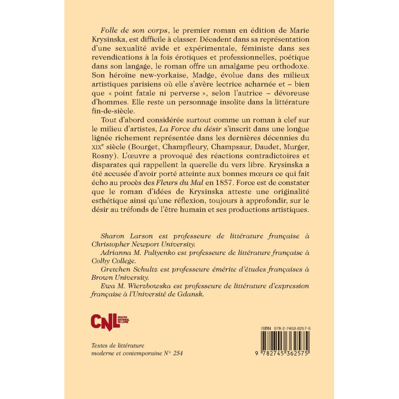 Folle de son corps, le premier roman en édition de Marie Krysinska, est difficile à classer. Décadent dans sa représentation d’une sexualité avide et expérimentale, féministe dans ses revendications à la fois érotiques et professionnelles, poétique dans son langage, le roman offre un amalgame peu orthodoxe. Son héroïne new-yorkaise, Madge, évolue dans des milieux artistiques parisiens où elle s’avère lectrice acharnée et – bien que « point fatale ni perverse », selon l’autrice – dévoreuse d’hommes. Elle reste un personnage insolite dans la littérature fin-de-siècle.