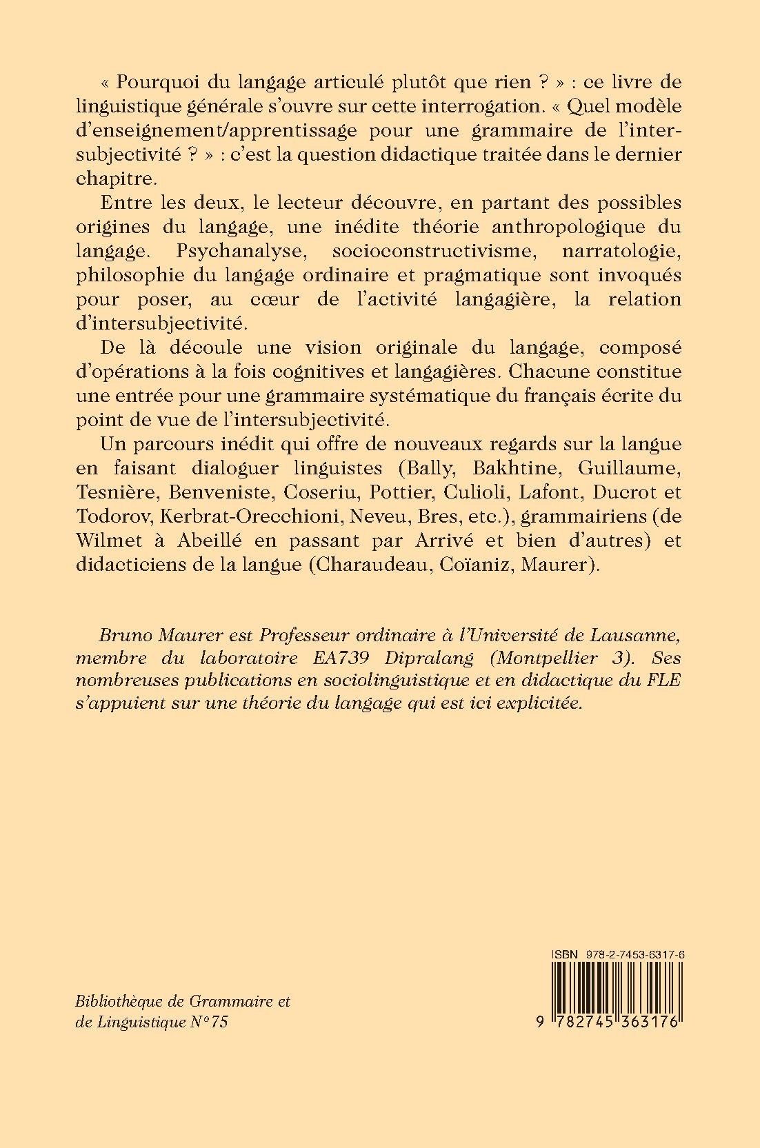 « Pourquoi du langage articulé plutôt que rien ? » : ce livre de linguistique générale s’ouvre sur cette interrogation. « Quel modèle d’enseignement/apprentissage pour une grammaire de l’intersubjectivité ? » : c’est la question didactique traitée dans le dernier chapitre.