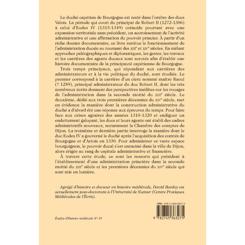 Trois temps principaux, qui répondent aux carrières des administrateurs et à la vie politique du duché, sont étudiés. Le premier correspond à la carrière d’un clerc nommé maître Raoul († 1289), principal administrateur du duc Robert II, dont les très nombreux écrits donnent des perspectives inédites sur les rouages de l’administration dans la seconde moitié du XIIIe siècle. Le deuxième, dédié aux trois premières décennies du XIVe siècle, met en évidence la manière dont la construction administrative du duché a d’abord été une réponse aux épreuves du temps. Pour faire face aux crises agraires des années 1310-1320 et endiguer un endettement galopant, les ducs et leurs agents ont établi des cadres administratifs nouveaux, notamment la Chambre des comptes de Dijon. La troisième et dernière partie interroge la manière dont le duc Eudes IV a gouverné le duché après l’acquisition des comtés de Bourgogne et d’Artois en 1330. Pour administrer ce vaste espace bourguignon, le pouvoir ducal s’est enraciné dans la ville de Dijon, alors érigée au rang de capitale administrative et financière.