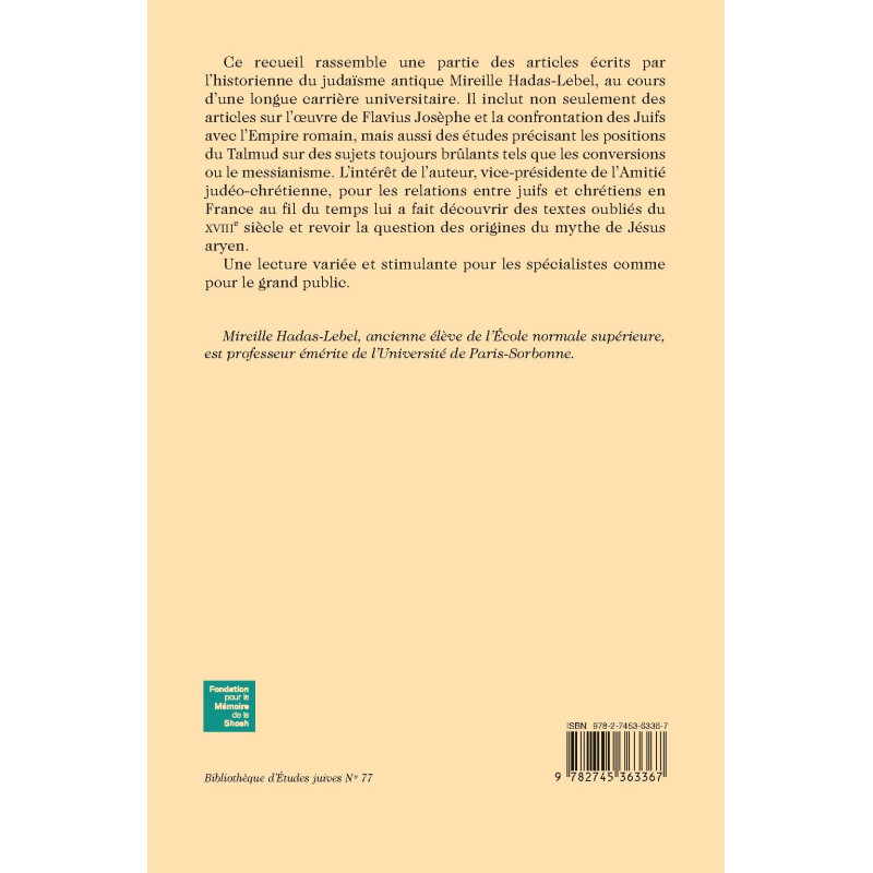 Ce recueil rassemble une partie des articles écrits par l’historienne du judaïsme antique Mireille Hadas-Lebel, au cours d’une longue carrière universitaire. Il inclut non seulement des articles sur l’œuvre de Flavius Josèphe et la confrontation des Juifs avec l’Empire romain, mais aussi des études précisant les positions du Talmud sur des sujets toujours brûlants tels que les conversions ou le messianisme. L’intérêt de l’auteur, vice-présidente de l’Amitié judéo-chrétienne, pour les relations entre juifs et chrétiens en France au fil du temps lui a fait découvrir des textes oubliés du XVIIIe siècle et revoir la question des origines du mythe de Jésus aryen.
