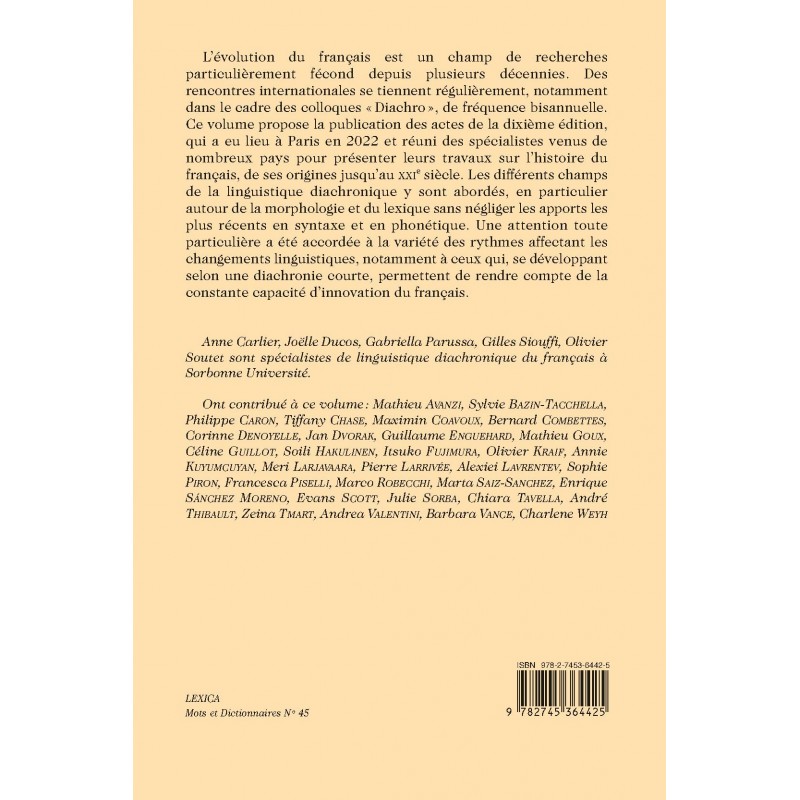 L’évolution du français est un champ de recherches particulièrement fécond depuis plusieurs décennies. Des rencontres internationales se tiennent régulièrement, notamment dans le cadre des colloques « Diachro », de fréquence bisannuelle. Ce volume propose la publication des actes de la dixième édition, qui a eu lieu à Paris en 2022 et réuni des spécialistes venus de nombreux pays pour présenter leurs travaux sur l’histoire du français, de ses origines jusqu’au XXIe siècle. Les différents champs de la linguistique diachronique y sont abordés, en particulier autour de la morphologie et du lexique sans négliger les apports les plus récents en syntaxe et en phonétique. Une attention toute particulière a été accordée à la variété des rythmes affectant les changements linguistiques, notamment à ceux qui, se développant selon une diachronie courte, permettent de rendre compte de la constante capacité d’innovation du français.
