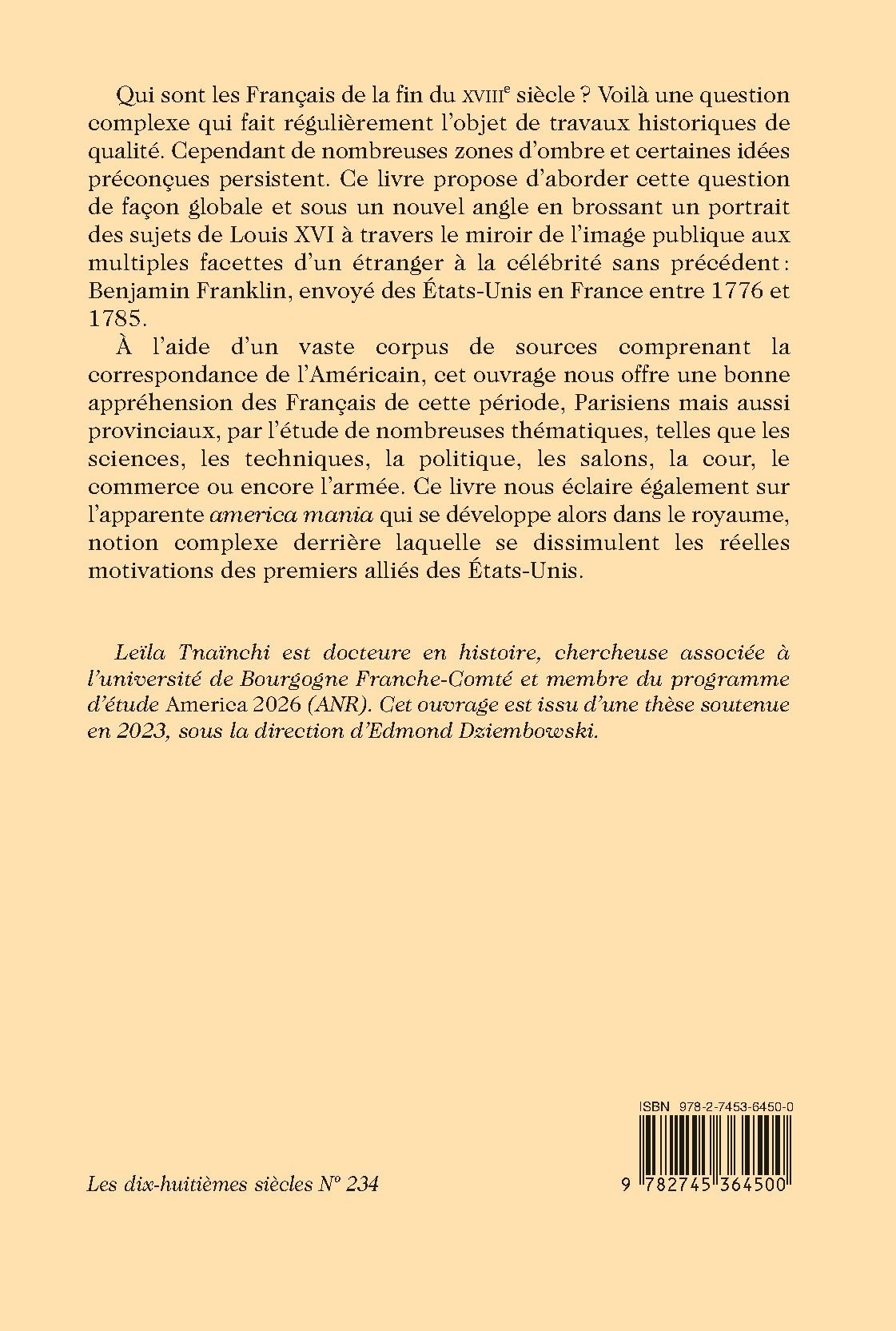 Qui sont les Français de la fin du XVIIIe siècle ? Voilà une question complexe qui fait régulièrement l’objet de travaux historiques de qualité. Cependant de nombreuses zones d’ombre et certaines idées préconçues persistent. Ce livre propose d’aborder cette question de façon globale et sous un nouvel angle en brossant un portrait des sujets de Louis XVI à travers le miroir de l’image publique aux multiples facettes d’un étranger à la célébrité sans précédent : Benjamin Franklin, envoyé des États-Unis en France entre 1776 et 1785.
