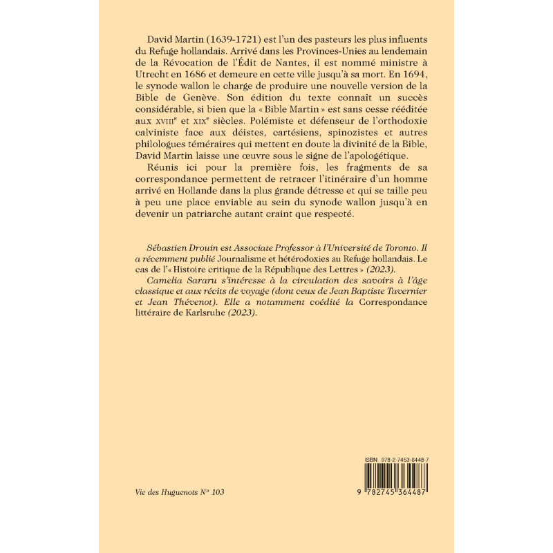 David Martin (1639-1721) est l’un des pasteurs les plus influents du Refuge hollandais. Arrivé dans les Provinces-Unies au lendemain de la Révocation de l’Édit de Nantes, il est nommé ministre à Utrecht en 1686 et demeure en cette ville jusqu’à sa mort. En 1694, le synode wallon le charge de produire une nouvelle version de la Bible de Genève. Son édition du texte connaît un succès considérable, si bien que la « Bible Martin » est sans cesse rééditée aux XVIIIe et XIXe siècles. Polémiste et défenseur de l’orthodoxie calviniste face aux déistes, cartésiens, spinozistes et autres philologues téméraires qui mettent en doute la divinité de la Bible, David Martin laisse une œuvre sous le signe de l’apologétique.