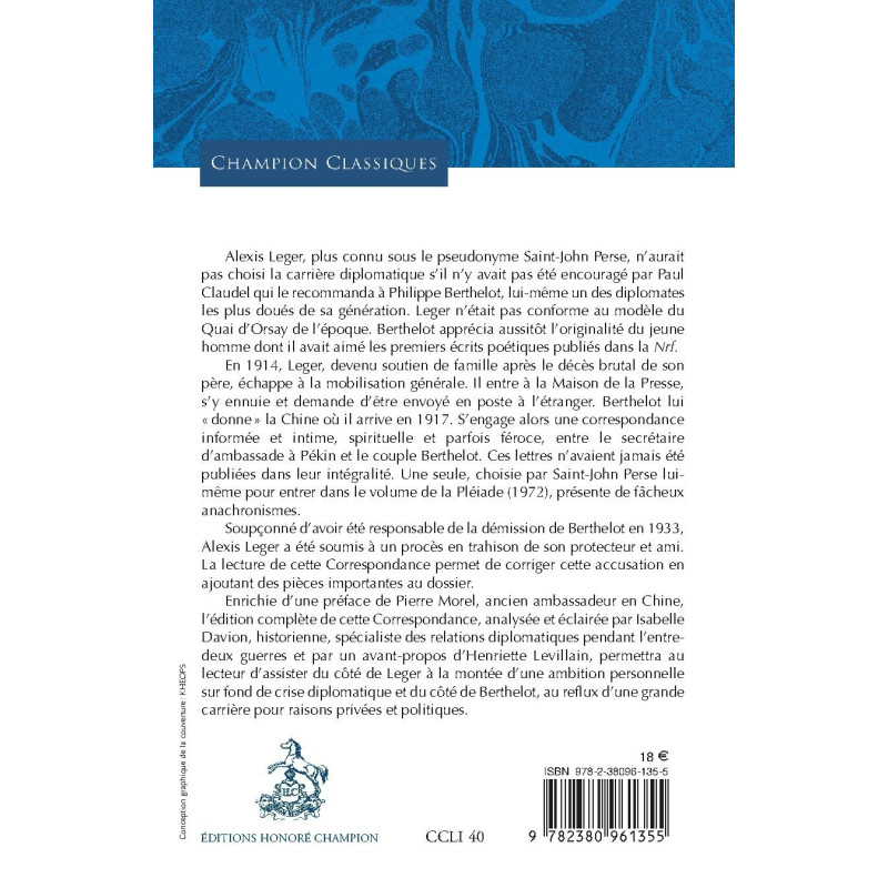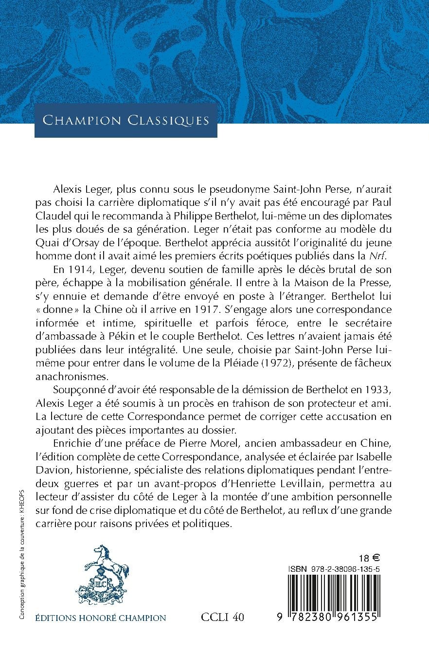 En 1914, Leger, devenu soutien de famille après le décès brutal de son père, échappe à la mobilisation générale. Il entre à la Maison de la Presse, s’y ennuie et demande d’être envoyé en poste à l’étranger. Berthelot lui « donne » la Chine où il arrive en 1917. S’engage alors une correspondance informée et intime, spirituelle et parfois féroce, entre le secrétaire d’ambassade à Pékin et le couple Berthelot. Ces lettres n’avaient jamais été publiées dans leur intégralité. Une seule, choisie par Saint-John Perse lui-même pour entrer dans le volume de la Pléiade (1972), présente de fâcheux anachronismes.