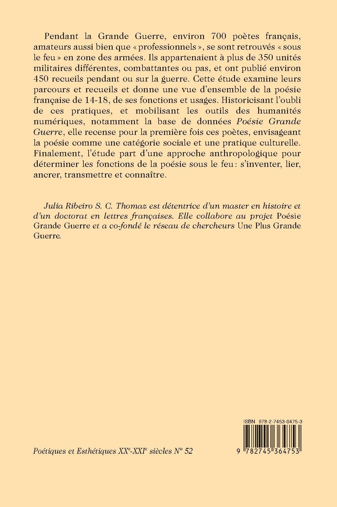 Pendant la Grande Guerre, environ 700 poètes français, amateurs aussi bien que « professionnels », se sont retrouvés « sous le feu » en zone des armées. Ils appartenaient à plus de 350 unités militaires différentes, combattantes ou pas, et ont publié environ 450 recueils pendant ou sur la guerre. Cette étude examine leurs parcours et recueils et donne une vue d’ensemble de la poésie française de 14-18, de ses fonctions et usages. Historicisant l’oubli de ces pratiques, et mobilisant les outils des humanités numériques, notamment la base de données Poésie Grande Guerre, elle recense pour la première fois ces poètes, envisageant la poésie comme une catégorie sociale et une pratique culturelle. Finalement, l’étude part d’une approche anthropologique pour déterminer les fonctions de la poésie sous le feu : s’inventer, lier, ancrer, transmettre et connaître.