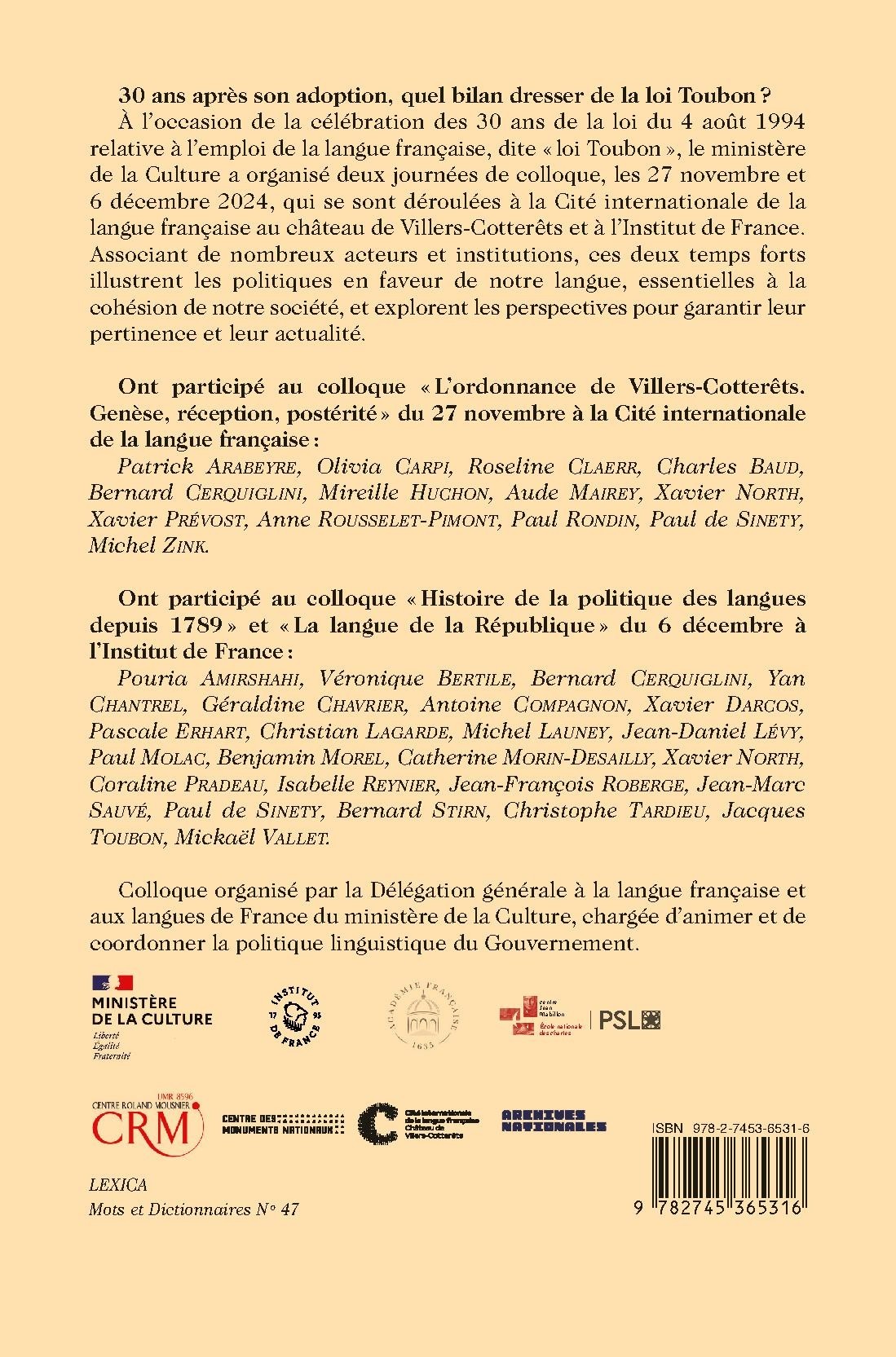 À l’occasion de la célébration des 30 ans de la loi du 4 août 1994 relative à l’emploi de la langue française, dite « loi Toubon», le ministère de la Culture a organisé deux journées de colloque, les 27 novembre et 6 décembre 2024, qui se sont déroulées à la Cité internationale de la langue française au château de Villers-Cotterêts et à l’Institut de France. Associant de nombreux acteurs et institutions, ces deux temps forts illustrent les politiques en faveur de notre langue, essentielles à la cohésion de notre société, et explorent les perspectives pour garantir leur pertinence et leur actualité.