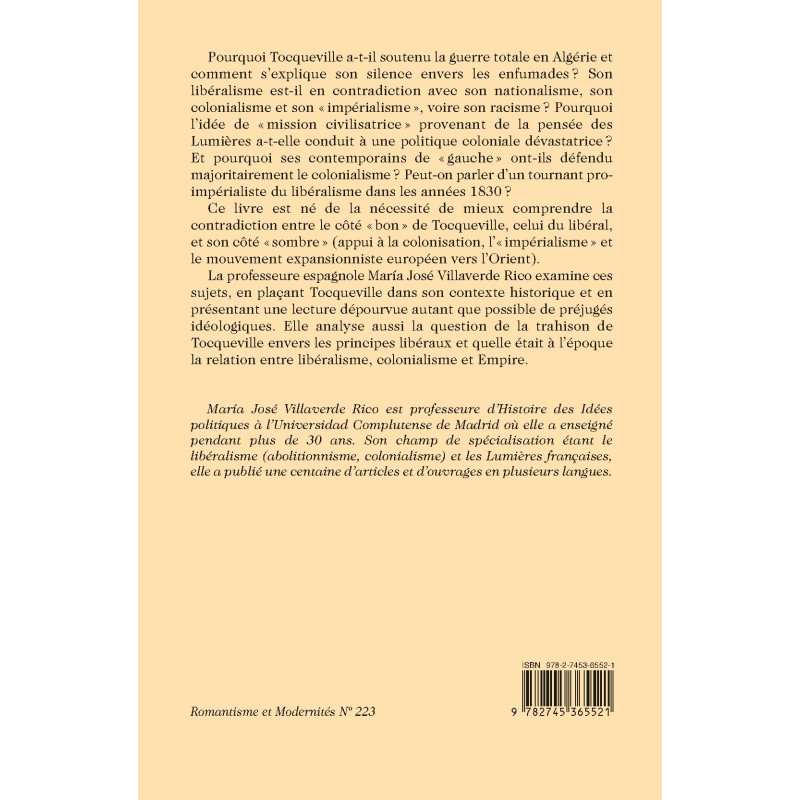 La professeure espagnole María José Villaverde Rico examine ces sujets, en plaçant Tocqueville dans son contexte historique et en présentant une lecture dépourvue autant que possible de préjugés idéologiques. Elle analyse aussi la question de la trahison de Tocqueville envers les principes libéraux et quelle était à l’époque la relation entre libéralisme, colonialisme et Empire.