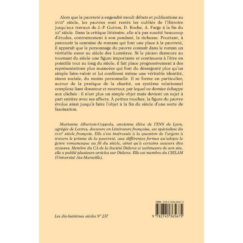 Alors que la pauvreté a engendré moult débats et publications au XVIIIe siècle, les pauvres sont restés les oubliés de l’Histoire jusqu’aux travaux de J.-P. Gutton, D. Roche, A. Farge à la fin du XXe siècle. Dans la critique littéraire, elle n’a pas suscité beaucoup d’études, contrairement à son pendant, la richesse. Pourtant, à parcourir la centaine de romans qui font une place à la pauvreté, il apparaît que le personnage du pauvre connaît dans le roman un véritable essor au siècle des Lumières. Si le picaro demeure au tournant du siècle une figure importante et continuera à l’être en pointillé tout au long du siècle, il fait place progressivement à des représentations plus nuancées qui font du désargenté plus qu’un simple faire-valoir et lui confèrent même une véritable identité, sinon sociale, du moins personnelle. Il se forme en particulier, autour de la pratique de la charité, un système relationnel complexe liant donateur et receveur, par lequel ce dernier échappe aux clichés : il n’est plus un simple objet mais devient un sujet à part entière avec ses affects. À petites touches, la figure du pauvre évolue ainsi jusqu’à faire l’objet à la fin du siècle d’une sorte de fascination.