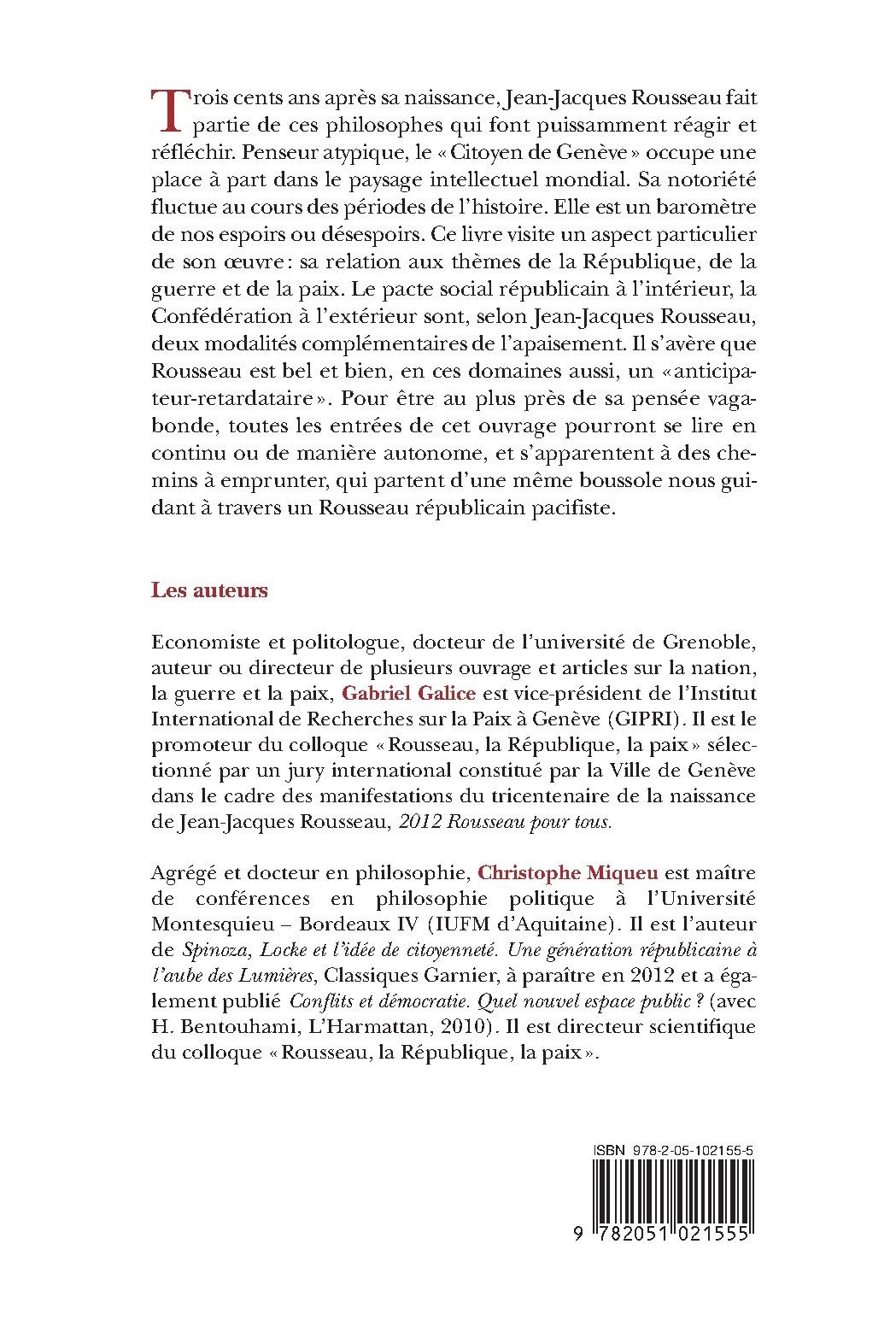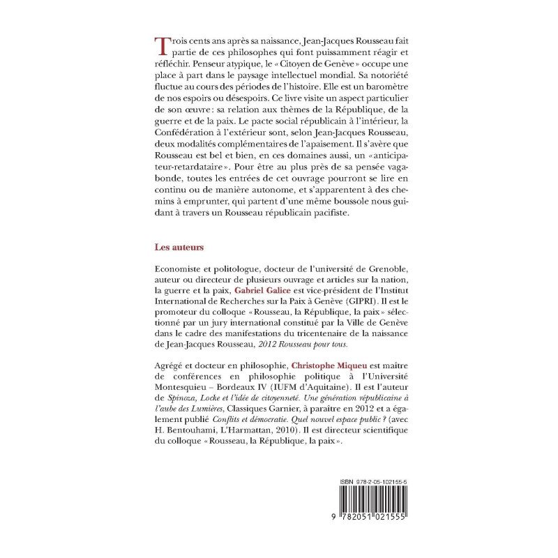 Trois cents ans après sa naissance, Jean-Jacques Rousseau fait partie de ces philosophes qui font puissamment réagir et réfléchir. Penseur atypique, le «Citoyen de Genève» occupe une place à part dans le paysage intellectuel mondial. Sa notoriété fluctue au cours des périodes de l’histoire. Elle est un baromètre de nos espoirs ou désespoirs. Ce livre visite un aspect particulier de son oeuvre: sa relation aux thèmes de la République, de la guerre et de la paix. Le pacte social républicain à l’intérieur, la Confédération à l’extérieur sont, selon Jean-Jacques Rousseau, deux modalités complémentaires de l’apaisement. Il s’avère que Rousseau est bel et bien, en ces domaines aussi, un «anticipateur- retardataire ». Pour être au plus près de sa pensée vagabonde, toutes les entrées de cet ouvrage, pourront se lire en continu ou de manière autonome, et s’apparentent à des chemins à emprunter, qui partent d’une même boussole nous guidant à travers un Rousseau républicain pacifiste. Économiste et politologue, docteur de l’université de Grenoble, auteur ou directeur de plusieurs ouvrages et articles sur la nation, l’Europe, la guerre, la paix et Jean-Jacques Rousseau, Gabriel Galice est vice-président de l’Institut International de Recherches sur la Paix à Genève (GIPRI). Il est le promoteur du colloque «Rousseau, la République, la paix » sélectionné par un jury international constitué par la Ville de Genève dans le cadre des manifestations du tricentenaire de la naissance de Jean-Jacques Rousseau, 2012 Rousseau pour tous. Agrégé et docteur en philosophie, Christophe Miqueu est maître de conférences en philosophie politique à l’Université Montesquieu – Bordeaux IV (IUFM d’Aquitaine). Il est l’auteur de Spinoza, Locke et l’idée de citoyenneté. Une génération républicaine à l’aube des Lumières, Classiques Garnier, à paraître en 2012 et a également publié Conflits et démocratie. Quel nouvel espace public ? (avec H. Bentouhami, L’Harmattan, 2010). Il est directeur scientifique du colloque «Rousseau, la République, la paix ».