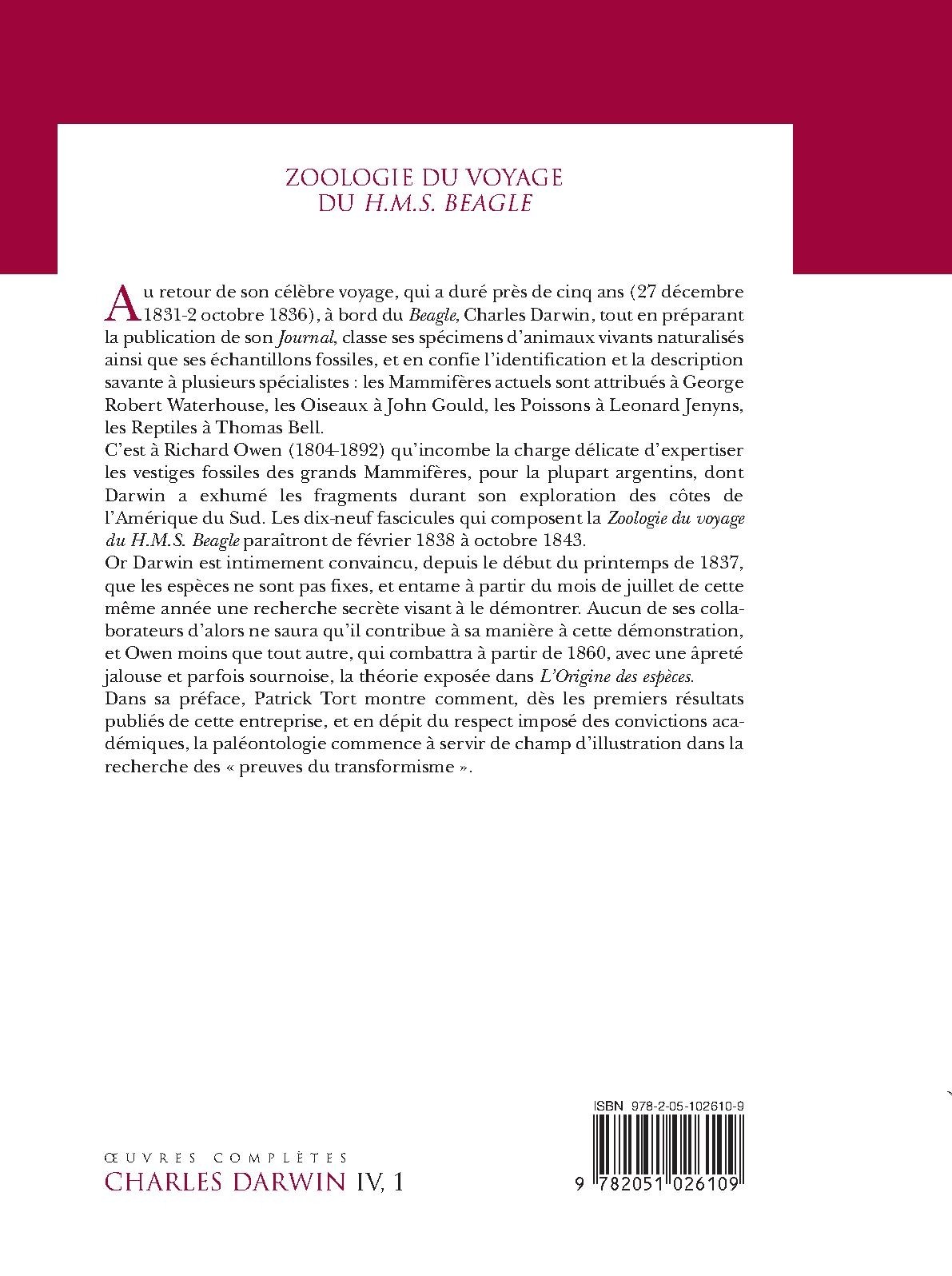 C’est à Richard Owen (1804-1892) qu’incombe la charge délicate d’expertiser les vestiges fossiles des grands Mammifères, pour la plupart argentins, dont Darwin a exhumé les fragments durant son exploration des côtes de l’Amérique du Sud. Les dix-neuf fascicules qui composent la « Zoologie du voyage du H.M.S. Beagle » paraîtront de février 1838 à octobre 1843.