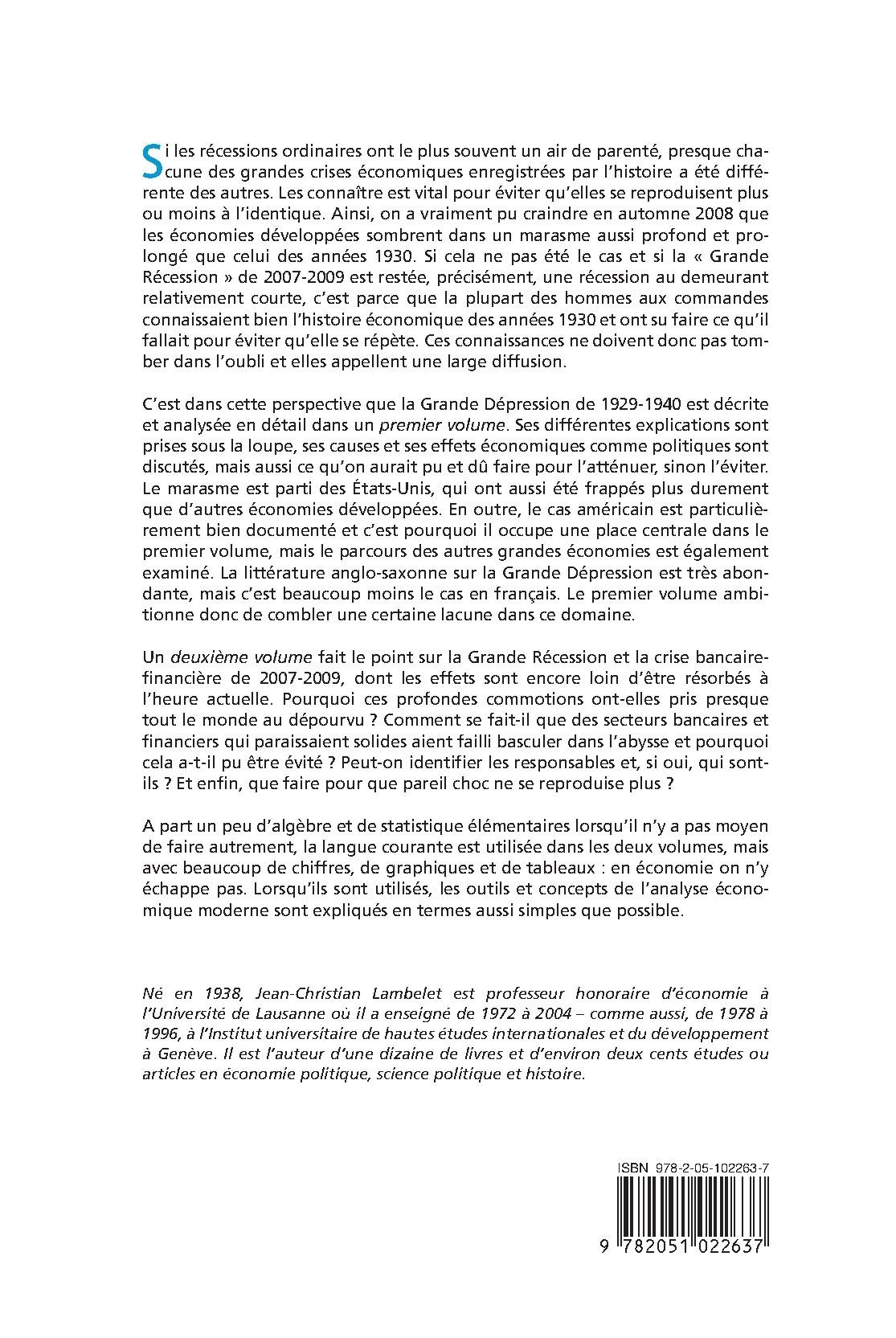 Si les récessions ordinaires ont le plus souvent un air de parenté, presque chacune des grandes crises économiques enregistrées par l`histoire a été différente des autres. Les connaître est vital pour éviter qu`elles se reproduisent plus ou moins à l`identique. Ainsi, on a vraiment pu craindre en automne 2008 que les économies développées sombrent dans un marasme aussi profond et prolongé que celui des années 1930. Si cela ne pas été le cas et si la " Grande Récession " de 2007-2009 est restée, précisément, une récession au demeurant relativement courte, c`est parce que la plupart des hommes aux commandes connaissaient bien l`histoire économique des années 1930 et ont su faire ce qu`il fallait pour éviter qu`elle se répète. Ces connaissances ne doivent donc pas tomber dans l`oubli et elles appellent une large diffusion. C`est dans cette perspective que la Grande Dépression de 1929-1940 est décrite et analysée en détail dans un premier volume. Ses différentes explications sont prises sous la loupe, ses causes et ses effets économiques comme politiques sont discutés, mais aussi ce qu`on aurait pu et dû faire pour l`atténuer, sinon l`éviter. Le marasme est parti des États-Unis, qui ont aussi été frappés plus durement que d`autres économies développées. En outre, le cas américain est particulièrement bien documenté et c`est pourquoi il occupe une place centrale dans le premier volume, mais le parcours des autres grandes économies est également examiné. La littérature anglo-saxonne sur la Grande Dépression est très abondante, mais c`est beaucoup moins le cas en français. Le premier volume ambitionne donc de combler une certaine lacune dans ce domaine. Un deuxième volume fait le point sur la Grande Récession et la crise bancaire-financière de 2007-2009, dont les effets sont encore loin d`être résorbés à l`heure actuelle. Pourquoi ces profondes commotions ont-elles pris presque tout le monde au dépourvu ? Comment se fait-il que des secteurs bancaires et financiers qui paraissaient solides aient failli basculer dans l`a