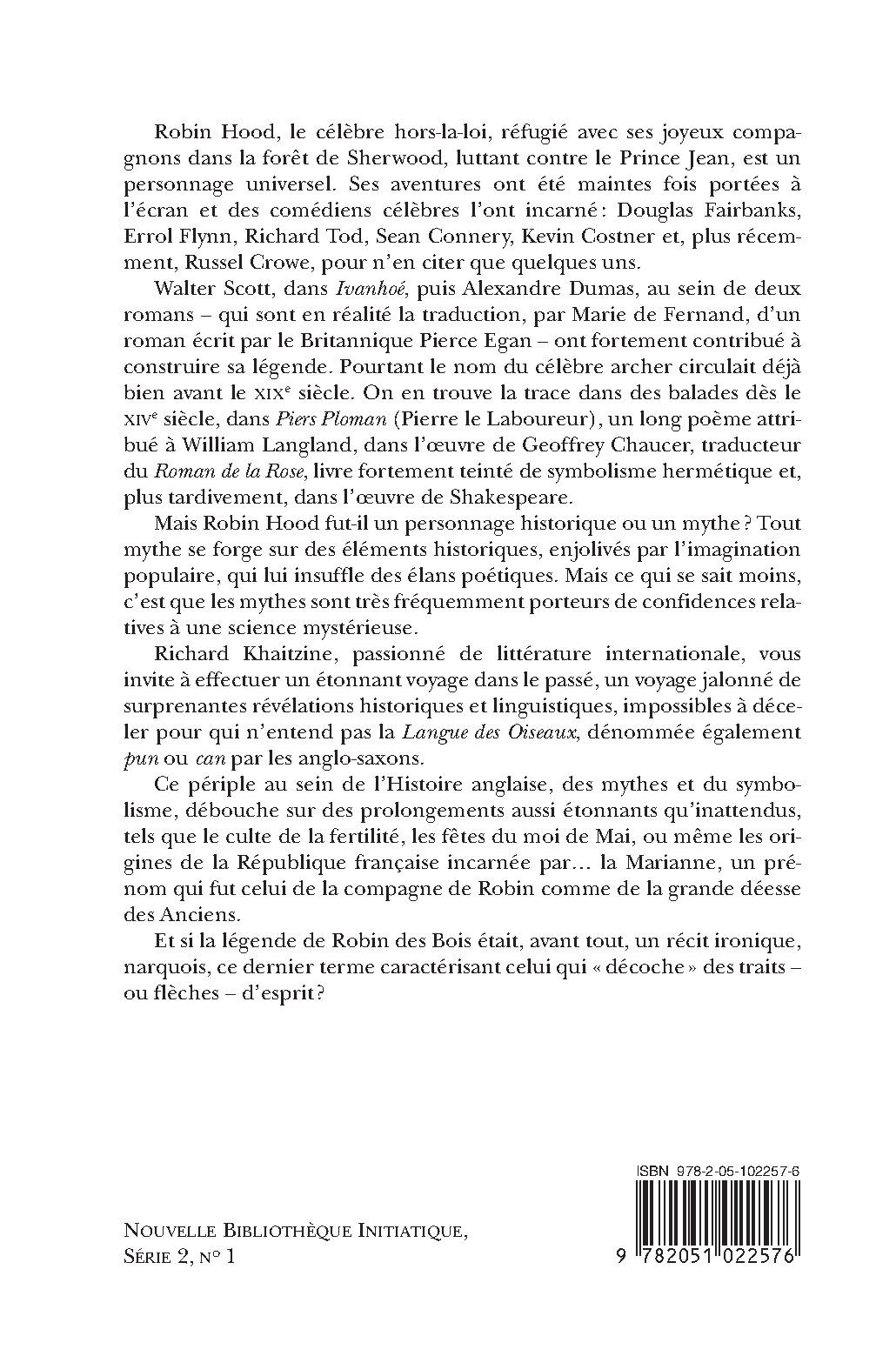 Robin Hood, le célèbre hors-la-loi, réfugié avec ses joyeux compagnons dans la forêt de Sherwood, luttant contre le Prince Jean est un personnage universel. Ses aventures ont été maintes fois portées à l`écran et des comédiens célèbres l`ont incarné: Douglas Fairbanks, Errol Flynn, Richard Todd, Sean Connery, Kevin Costner et, plus récemment, Russel Crowe, pour n`en citer que quelques-uns. Walter Scott, dans Ivanhoé, puis Alexandre Dumas, au sein de deux romans - qui sont en réalité la traduction, par Marie de Fernand, d`un roman écrit par le Britannique Pierce Egan - ont fortement contribué à construire sa légende. Pourtant le nom du célèbre archer circulait déjà bien avant le XIXe siècle. On en trouve la trace dans des ballades dès le XIVe, dans Piers Plowman (Pierre le Laboureur), un long poème, attribué à William Langland, dans l`œuvre de Geoffrey Chaucer, traducteur du Roman de la Rose, livre fortement teinté de symbolisme hermétique et, plus tardivement, dans l`oeuvre de Shakespeare. Mais Robin Hood fut-il un personnage historique ou un mythe ? Tout mythe se forge sur des éléments historiques, enjolivés par l`imagination populaire, qui lui insuffle des élans poétiques. Mais ce qui se sait moins, c`est que les mythes sont très fréquemment porteurs de confidences relatives à une science mystérieuse. Richard Khaïtzine, bien connu du monde de l`ésotérisme et féru de littérature internationale, nous invite à effectuer un étonnant voyage dans le passé, un voyage jalonné de surprenantes révélations historiques et linguistiques, impossibles à déceler pour qui n`entend pas la Langue des Oiseaux, dénommée également pun ou cant par les anglo-saxons. Ce périple au sein de l`Histoire anglaise, des mythes et du symbolisme, débouche sur des prolongements aussi étonnants qu`inattendus, tels que le culte de la fertilité, les fêtes du mois de Mai ou même les origines de la république française incarnée par… la Marianne, un prénom qui fut celui de la compagne de Robin comme de la grande déesse des Anciens.