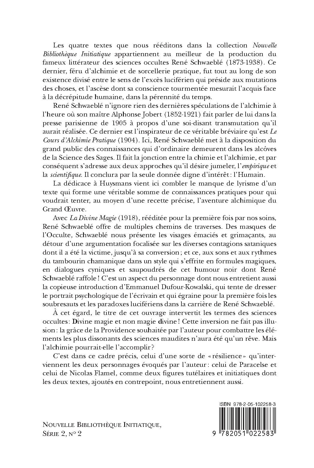 René Schwaeblé n’ignore rien des dernières spéculations de l’alchimie à l’heure où son maître Alphonse Jobert (1852-1921) fait parler de lui dans la presse parisienne de 1905, à propos d’une soi-disant transmutation qu’il aurait réalisée. Ce dernier est l’inspirateur de ce véritable bréviaire qu’est Le Cours d’Alchimie Pratique (1904). Ici, René Schwaeblé met à la disposition du grand public des connaissances qui, d’ordinaire, demeurent dans l’alcôve de la « Science des Sages ». Il fait la jonction entre la chimie et l’alchimie et, par conséquent, s’adresse aux deux approches qu’il désire jumeler, l’empirique et la scientifique. Il conclura par la seule donnée digne d’intérêt : l’Humain. La dédicace à Huysmans vient ici combler le manque de lyrisme d’un texte qui forme une véritable somme de connaissances pratiques pour qui voudrait tenter, au moyen d’une recette précise, l’aventure alchimique du Grand Œuvre. Avec La Divine Magie (1918), réédité ici pour la première fois par nos soins, René Schwaeblé offre de multiples chemins de traverses. À cet égard, le titre de cet ouvrage intervertit les termes des sciences occultes : Divine magie et non magie divine ! Cette inversion ne fait pas illusion : la grâce de la Providence souhaitée par l’auteur pour combattre les éléments les plus dissonants des sciences maudites, n’aura été qu’un rêve. Mais l’alchimie pourrait-elle l’accomplir ? C’est dans ce cadre précis, celui d’une sorte de « résiliance » qu’interviennent les deux personnages évoqués par l’auteur : celui de Paracelse et celui de Nicolas Flamel, comme deux figures tutélaires et initiatiques dont les deux textes, ajoutés en contrepoint, nous entretiennent aussi.