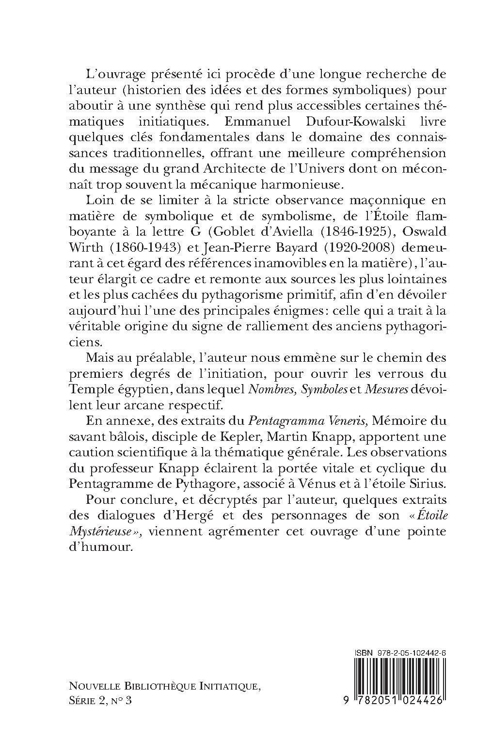 L’ouvrage présenté ici procède d’une longue recherche de l’auteur (historien des idées et des formes symboliques) pour aboutir à une synthèse qui rend plus accessibles certaines thématiques initiatiques. Emmanuel Dufour-Kowalski livre quelques clés fondamentales dans le domaine des connaissances traditionnelles, offrant une meilleure compréhension du message du grand Architecte de l’Univers dont on méconnaît trop souvent la mécanique harmonieuse. Loin de se limiter à la stricte observance maçonnique en matière de symbolique et de symbolisme, de l’Étoile flamboyante à la lettre G (Goblet d’Aviella (1846-1925), Oswald Wirth (1860-1943) et Jean-Pierre Bayard (1920-2008) demeurant à cet égard des références inamovibles en la matière), l’auteur élargit ce cadre et remonte aux sources les plus lointaines et les plus cachées du pythagorisme primitif, afin d’en dévoiler aujourd’hui l’une des principales énigmes : celle qui a trait à la véritable origine du signe de ralliement des anciens pythagoriciens. Mais au préalable, l’auteur nous emmène sur le chemin des premiers degrés de l’initiation, pour ouvrir les verrous du Temple égyptien, dans lequel Nombres, Symboles et Mesures dévoilent leur arcane respectif. En annexe, des extraits du Pentagramma Veneris, Mémoire du savant bâlois, disciple de Kepler, Martin Knapp, apportent une caution scientifique à la thématique générale. Les observations du professeur Knapp éclairent la portée vitale et cyclique du Pentagramme de Pythagore, associé à Vénus et à l’étoile Sirius. Pour conclure, et décryptés par l’auteur, quelques extraits des dialogues d’Hergé et des personnages de son «Étoile Mystérieuse », viennent agrémenter cet ouvrage d’une pointe d’humour.