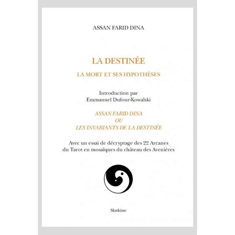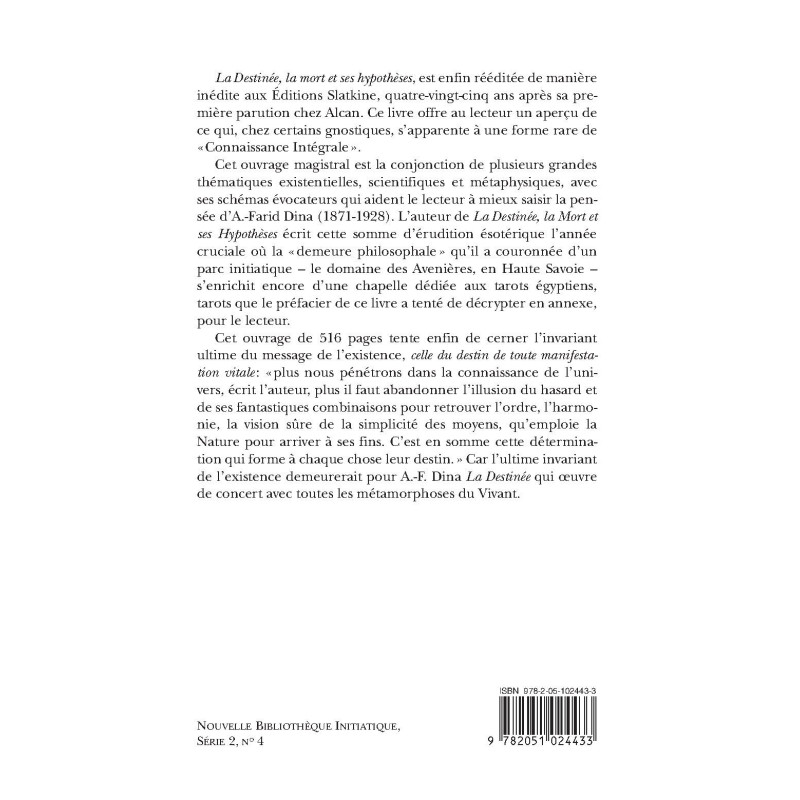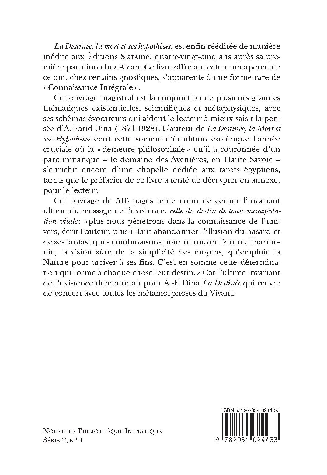 La Destinée, la mort et ses hypothèses, est enfin rééditée de manière inédite aux Éditions Slatkine, quatre-vingt-cinq ans après sa première parution chez Alcan. Ce livre offre au lecteur un aperçu de ce qui, chez certains gnostiques, s’apparente à une forme rare de « Connaissance Intégrale ». Cet ouvrage magistral est la conjonction de plusieurs grandes thématiques existentielles, scientifiques et métaphysiques, avec ses schémas évocateurs qui aident le lecteur à mieux saisir la pensée d’A.-Farid Dina (1871-1928). L’auteur de La Destinée, la Mort et ses Hypothèses écrit cette somme d’érudition ésotérique l’année cruciale où la «demeure philosophale » qu’il a couronnée d’un parc initiatique – le domaine des Avenières, en Haute Savoie – s’enrichit encore d’une chapelle dédiée aux tarots égyptiens, tarots que le préfacier de ce livre a tenté de décrypter en annexe, pour le lecteur. Cet ouvrage de 516 pages tente enfin de cerner l’invariant ultime du message de l’existence, celle du destin de toute manifestation vitale : « plus nous pénétrons dans la connaissance de l’univers, écrit l’auteur, plus il faut abandonner l’illusion du hasard et de ses fantastiques combinaisons pour retrouver l’ordre, l’harmonie, la vision sûre de la simplicité des moyens, qu’emploie la Nature pour arriver à ses fins. C’est en somme cette détermination qui forme à chaque chose leur destin. » Car l’ultime invariant de l’existence demeurerait pour A.-F. Dina La Destinée qui œuvre de concert avec toutes les métamorphoses du Vivant.