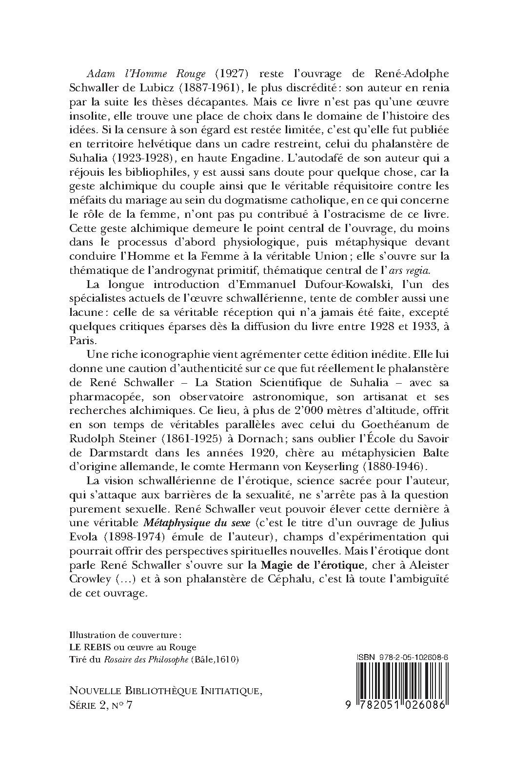 Adam l’Homme Rouge (1927) reste l’ouvrage de René-Adolphe Schwaller de Lubicz (1887-1961), le plus discrédité : son auteur en renia par la suite les thèses décapantes. Mais ce livre n’est pas qu’une oeuvre insolite, elle trouve une place de choix dans le domaine de l’histoire des idées. Si la censure à son égard est restée limitée, c’est qu’elle fut publiée en territoire helvétique dans un cadre restreint, celui du phalanstère de Suhalia (1923-1928), en haute Engadine. L’autodafé de son auteur qui a réjouis les bibliophiles, y est aussi sans doute pour quelque chose, car la geste alchimique du couple ainsi que le véritable réquisitoire contre les méfaits du mariage au sein du dogmatisme catholique, en ce qui concerne le rôle de la femme, n’ont pas pu contribué à l’ostracisme de ce livre. Cette geste alchimique demeure le point central de l’ouvrage, du moins dans le processus d’abord physiologique, puis métaphysique devant conduire l’Homme et la Femme à la véritable Union ; elle s’ouvre sur la thématique de l’androgynat primitif, thématique central de l’ars regia.